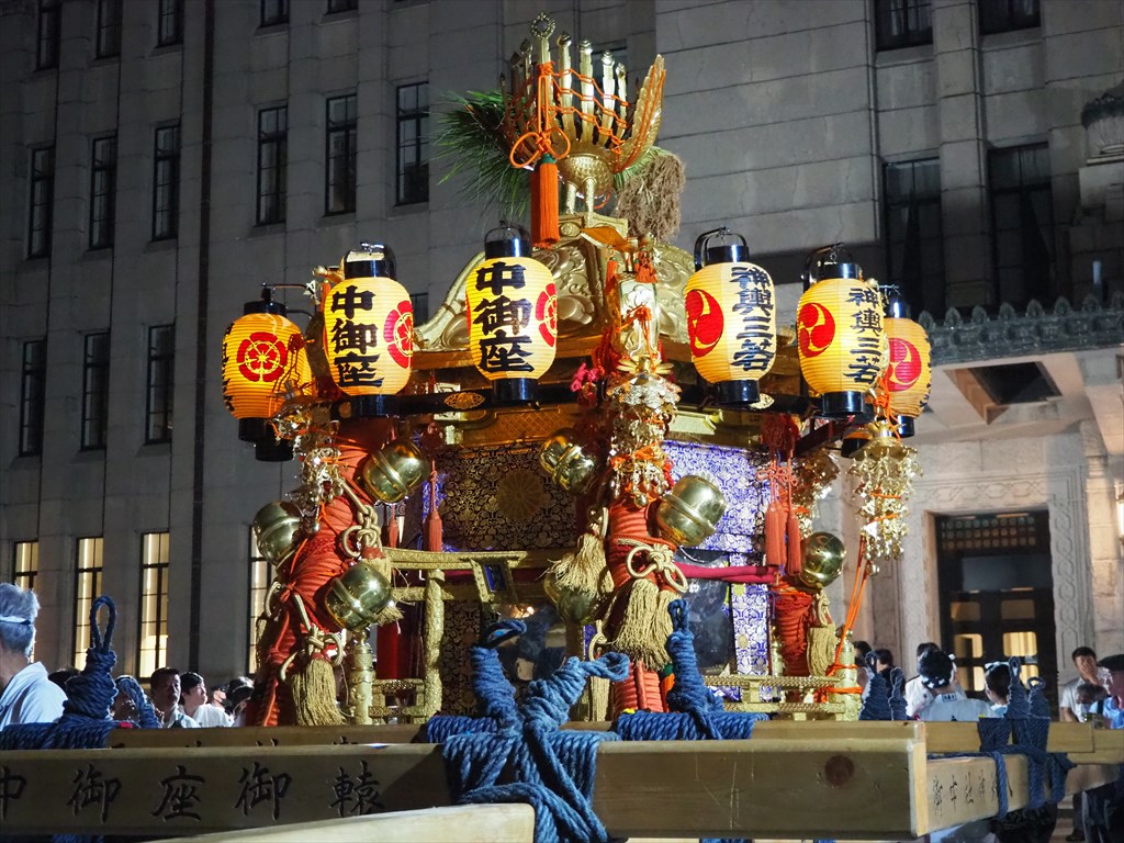 今回も昨年に続き、中御座の神輿が三条大橋を渡って市役所前に進む様子を眺めてきました。市役所前では大船鉾の囃子方による奉納もあり、神輿のライトアップも行われました。休憩も兼ねており、みこし弁当をいただく輿丁(よちょう)たちの姿も印象的です。