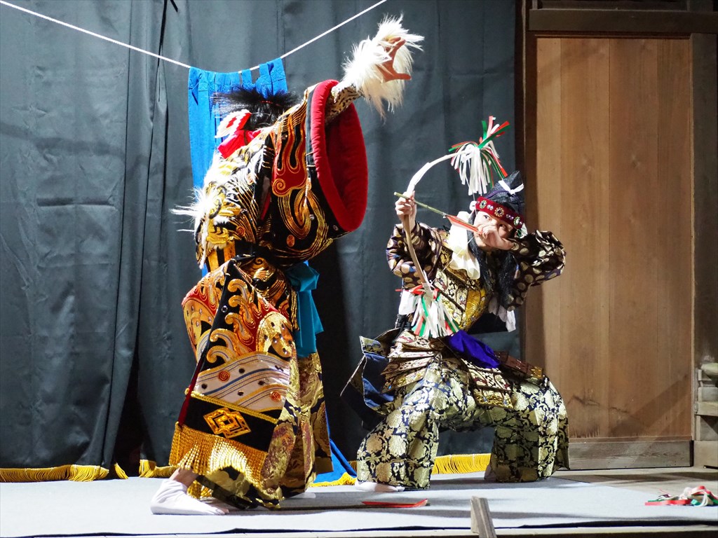 一計を案じたスサノオは、種々の木の実で醸した毒酒を飲ませ、酔ったところを退治します。この演目では何といっても、大蛇の動きが注目です。まるで生きているかのような動きを見せたり、口から煙を吐きながら現れます。そして最後は、スバっと首を取られてしまうのです。