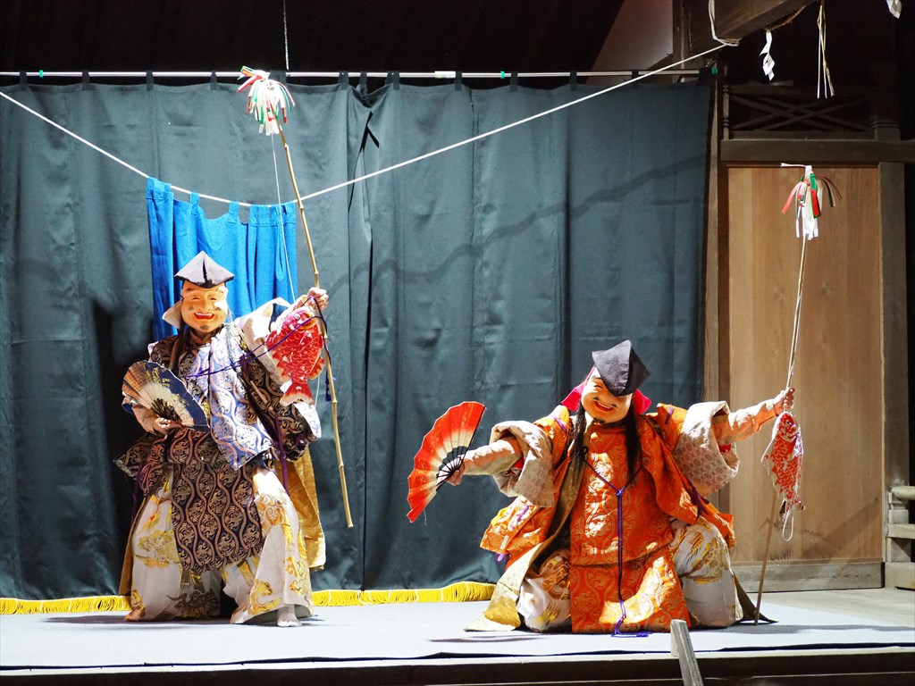 さらに奉納された「恵比須」は、釣りが上手な神様として知られる恵比須様が鯛を釣り上げる場面を演じます。とても動きが大きく軽快で、楽しそうに演じていました。演技の途中では、お決まりの飴を撒く場面もあり、観客も喜んでいました。鯛が客席から出てくる演出も面白いです。