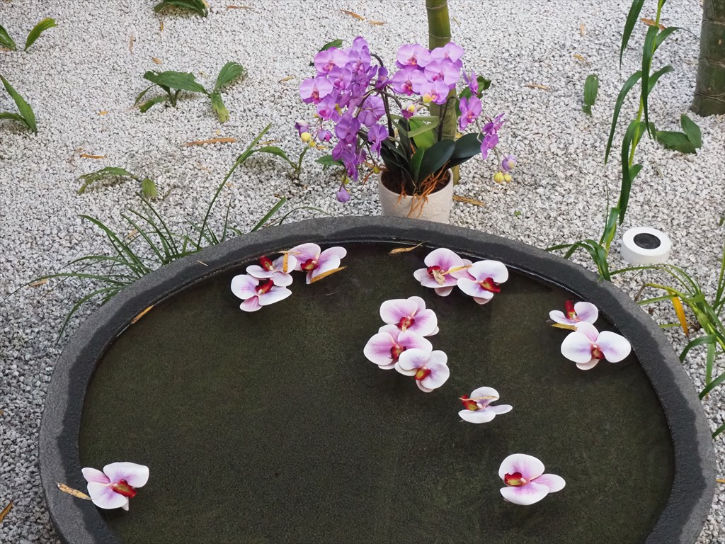 また、中庭は珍しい亀甲竹が植えられ、蘭渓道隆にちなんで蘭の花もたくさん植わっています。樂雅臣氏が奉納された石の器「円宗」には、蘭の花が浮かべられていました。植栽にはプラントハンターとして活躍する西畠清順氏が携わっておられ、初夏には蘭の花も境内を彩っています。