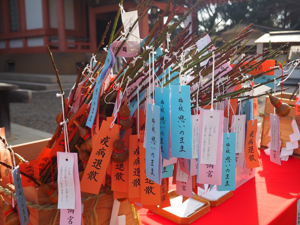 ひょうたんに入っている玄米は、道真公の命日である2月25日に「紙立(こうだて)」として神前に供えられたもの(恐らく昨年のもの)。紙立(こうだて)は、玄米に梅の枝を差したもので、紅梅は33本、白梅は42本が神社に奉仕する神人(じにん)の方々によって奉納されています。33と42は男女の厄年の年齢を表し、厄除けの願をかけています。「思いのまま」では、ひょうたんに入れられたこの玄米を自宅で炊くご飯に混ぜて食すことで厄除けのご利益を授かれるのだそうです。
