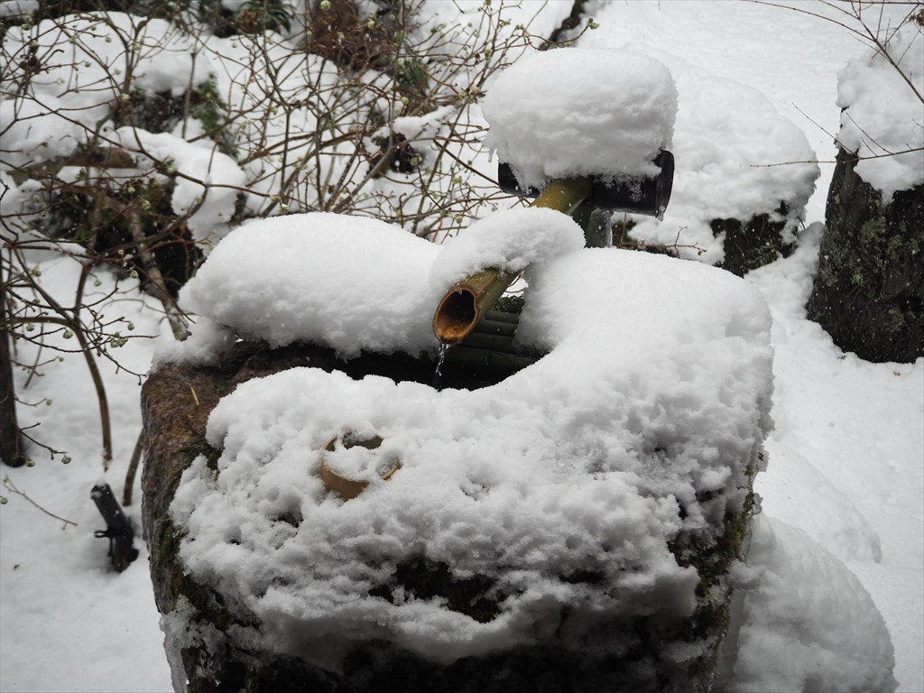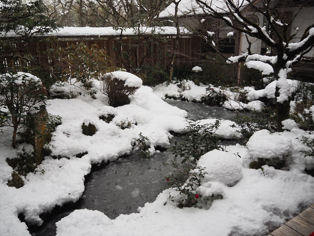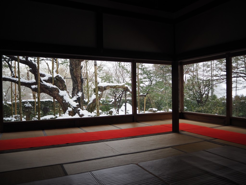 見事に雪をまとった五葉松。各方向へと伸びるどっしりとした枝ぶりは、歴史の深さを感じさせます。それもそのはずで、樹齢は700年余りを数える、京都でも有数の古い松。