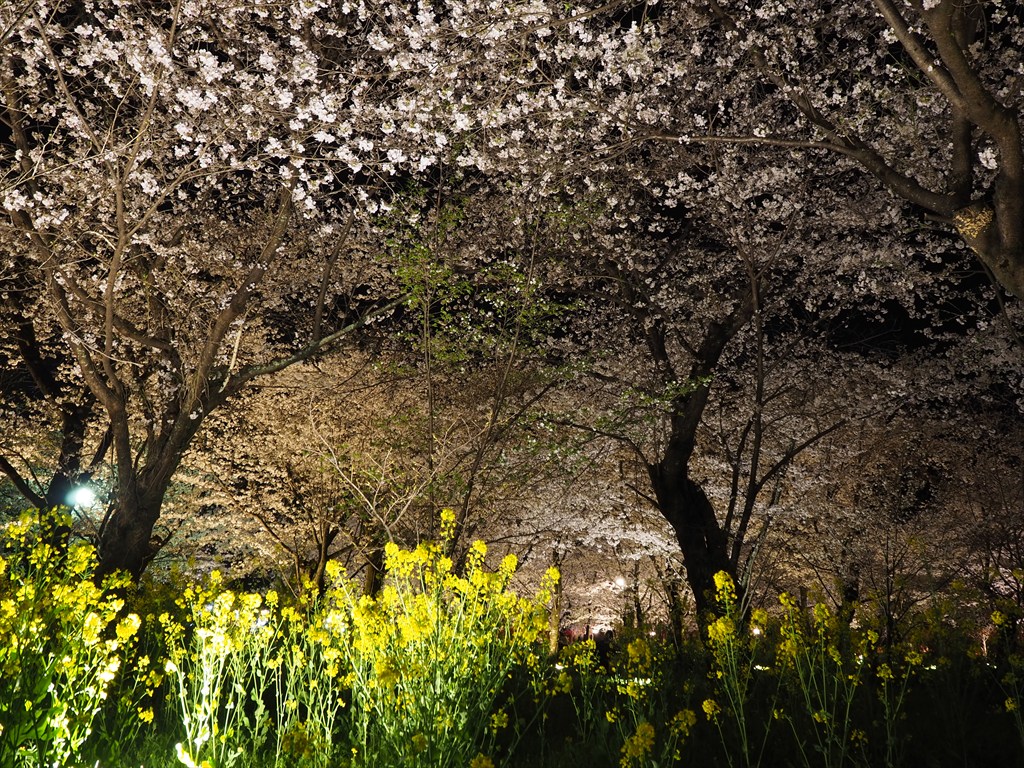 ソメイヨシノが満開の時には空を雲のように覆うほどで、菜の花の香りも漂って幻想的でした。多少のキッチンカーも入っており、ベンチに座りながら桜を眺めることもできます。ライトアップは今週末までの予定です。