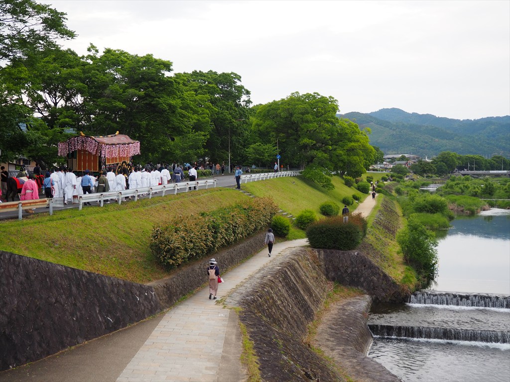 先日も掲載した葵祭の路頭の儀。今回は下鴨神社から上賀茂神社へ向かう途中に通過する賀茂川沿いの道筋での写真です。加茂街道は緑の木々が背景で写真映えもするスポット。沿道では多くの方が見守っていました。