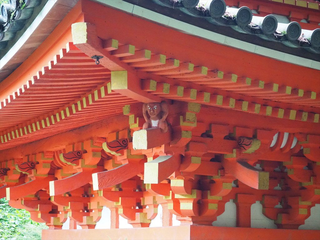 境内で目を引くのは、朱色が鮮やかな三重塔。室町時代に建てられたもので、東山の八坂の塔(1440年)とほぼ同時期の1442年の建立です。2003年に大修復が完了し、往時の色彩を取り戻しました。山中に佇む姿が美しく、緑の時期も朱色が映えて美しいです。岩船寺の三重塔は、なんと周りの高い場所から、二層目・三層目と同じくらいの目線で見られてしまうという特徴もあります。こうして塔を少し高い場所から間近で見られる場所はなかなかありませんので、貴重なロケーション。塔の屋根を支えている天邪気(あまのじゃく)の頑張りも近くで見られます。
