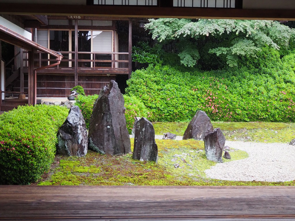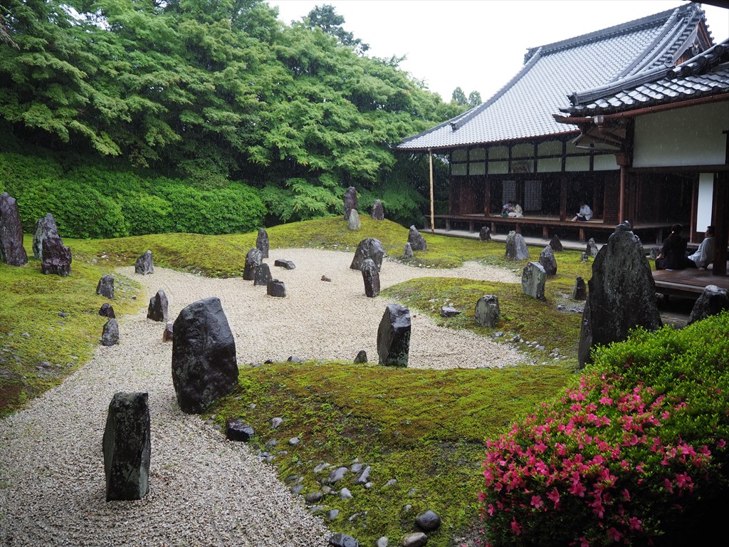 光明院は東福寺の南にある塔頭寺院で、重森三玲によって整備された境内の波心(はしん)の庭は、どの方向から見ても美しく見えるようにと設計されています。別名「虹の苔寺」という素敵な呼び名もあるように、苔(ウズマキゴケ)が見事な庭園。やはり苔は雨の日が水を吸って元気です。しっとりとした緑の眺め、雨の音は心を癒やしてくれます。