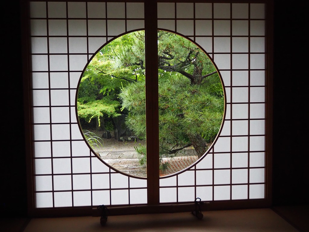 光明院の庭園の魅力は、室内から額縁に入った絵画のように眺めることができること。人も多くはなく、自分の好みの風景を切り取って静かに座して心行くまで眺めることができます。丸窓もあり趣ある風景を楽しめます。拝観料は500円。入口の竹筒にお忘れなくお納めください。