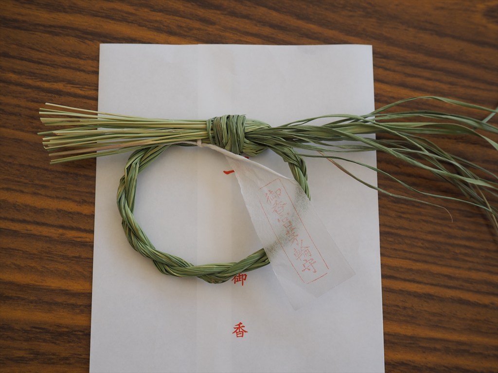 大祓詞に続いて神職の方が茅の輪をくぐり、その後一般の方がくぐって行きました。多くの方が列を作って順番に左→右→左とくぐっていきます。また、人形(ひとがた)に氏名と数え年を書いて体をなでて息を吹きかけ厄を移して奉納すると、ミニ茅の輪をお下がりとして授与していただけました(一体100円)。