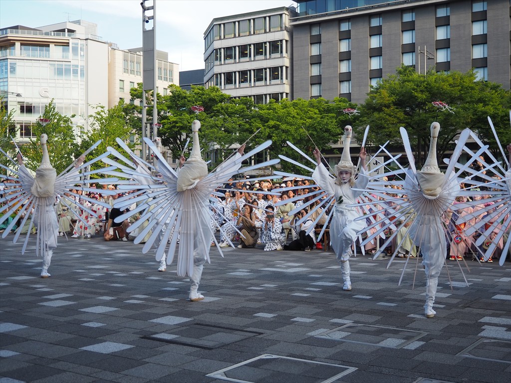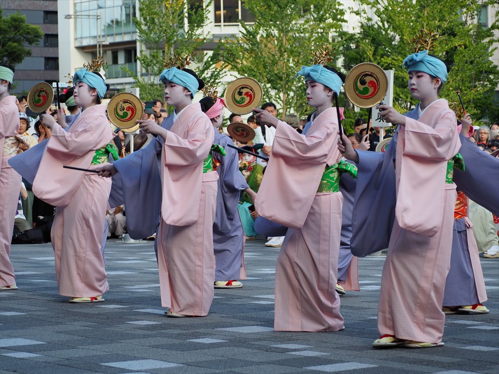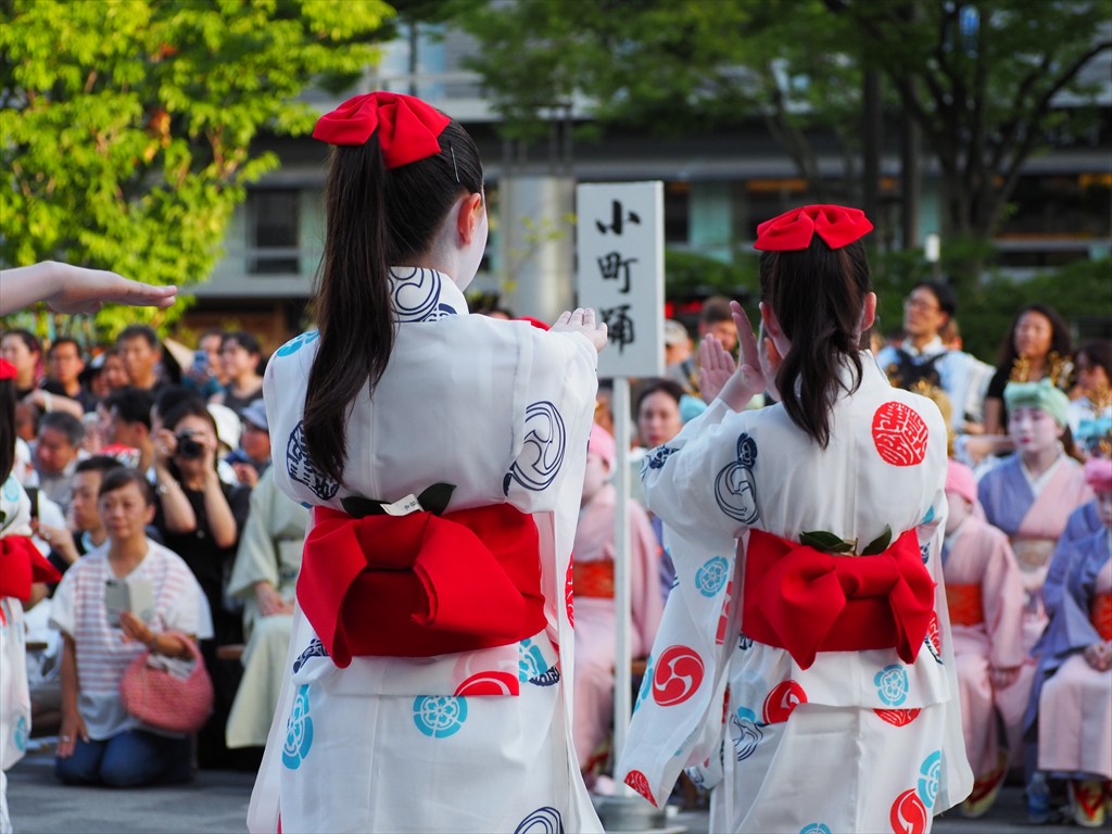 神輿洗の神輿を迎えるのがお迎え提灯行列。八坂神社から京都市役所前に進んだ一行が奉納するのは、鷺踊と小町踊、そして祇園祭音頭です。いずれも可愛らしい子どもたちによる踊りで、しっかり練習してきた姿を見せてくれます。