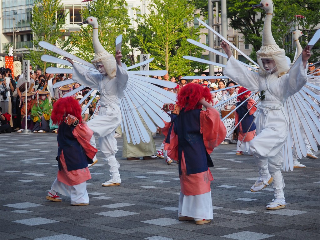 鷺踊(鷺踊り)は、かつて存在した鵲鉾(かささぎほこ)に付随する鷺舞がルーツです。鷺舞は昭和の段階では絶えていたため、島根県津和野の八坂神社に伝わっていたものを逆輸入し、節や踊りは現代風にアレンジしたもの。鷺踊には赤い”しゃぐま”の子どもたちもいて、幼稚園や保育園くらいの小さな子がかわいらしく鷺の間を歩いて行きます。