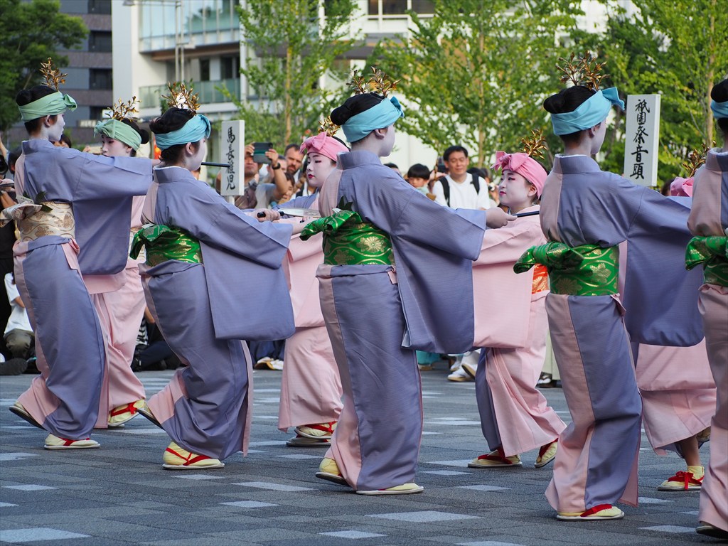 小町踊の皆様は小学生くらいの少女。目はぱっちりメイクです。小さい子から大きい子まで、所作の美しい踊りを団扇太鼓とともに披露してくれました。左右で色彩が異なる片身替わりの着物も印象的です。