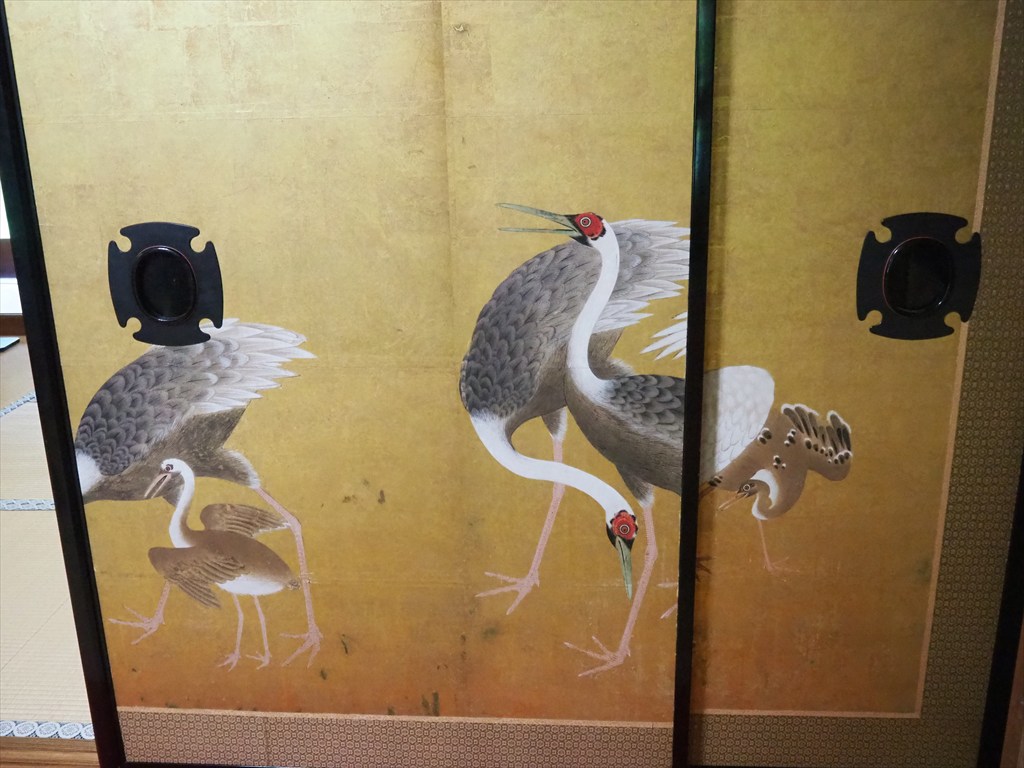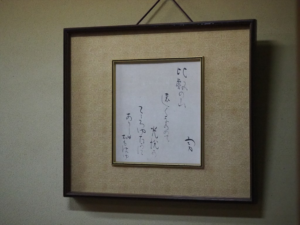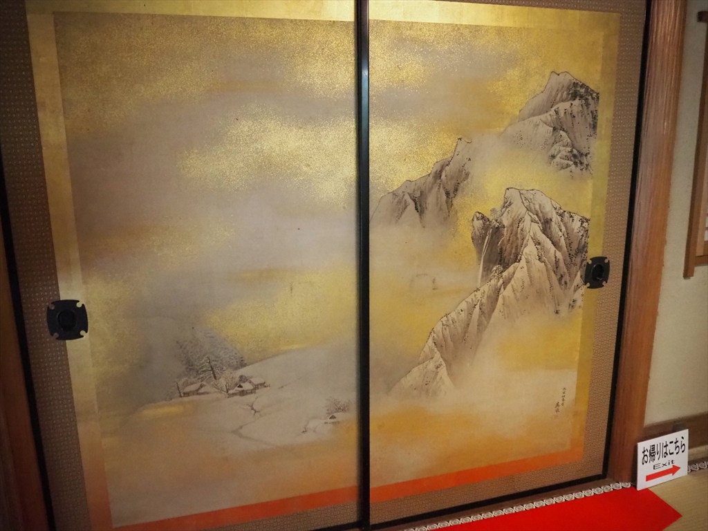今回公開されている峰玉亭は、昭和37年~40年頃に新築された木造平屋建ての建物で、迎賓館や着物の商談スペースとしても使われました。棟梁に松山が指示を与えながら普請したと伝わり、良質な木材や竹材を多用し、松山のこだわりが随所に見られる個性的かつ実用的な空間構成となっています。亭内には狩野派や円山応挙など、松山が収集した襖絵がはまり、吉井勇の歌の色紙、竹内栖鳳の掛け軸もあります。