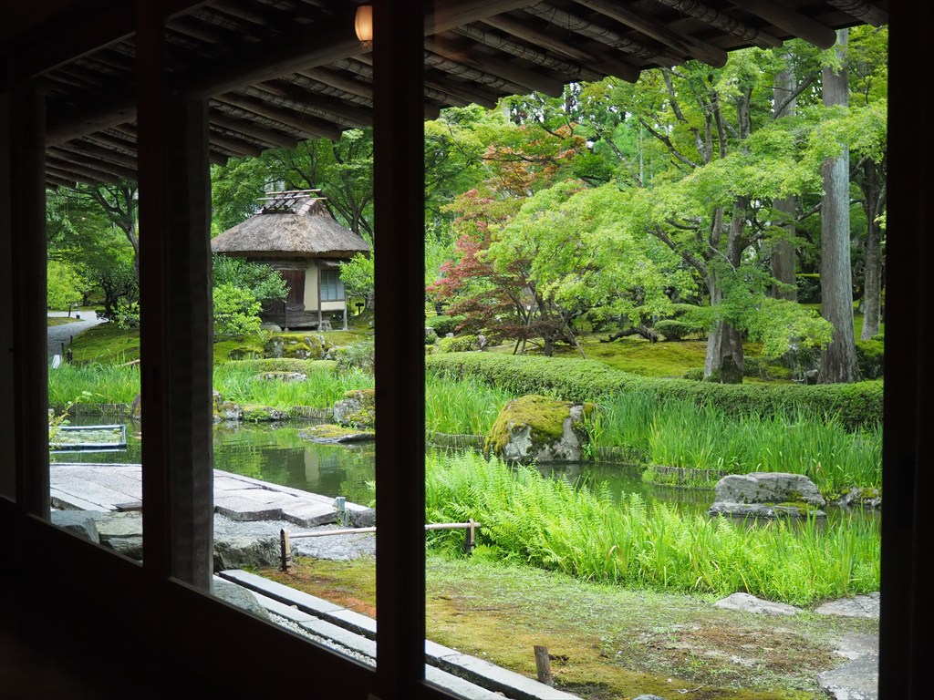 松山は昭和40年に死去し、亭内に絵画がかかっていない枠のみがあるのは、そうした理由によります。北山杉が用いられ、着物のご夫婦が横並びに歩けるという広い廊下、今では貴重な煤竹(すすだけ)がふんだんに用いられていたり、個性的な意匠の天井や南天の床柱など、見どころがそこかしこにあり感嘆するばかりです。