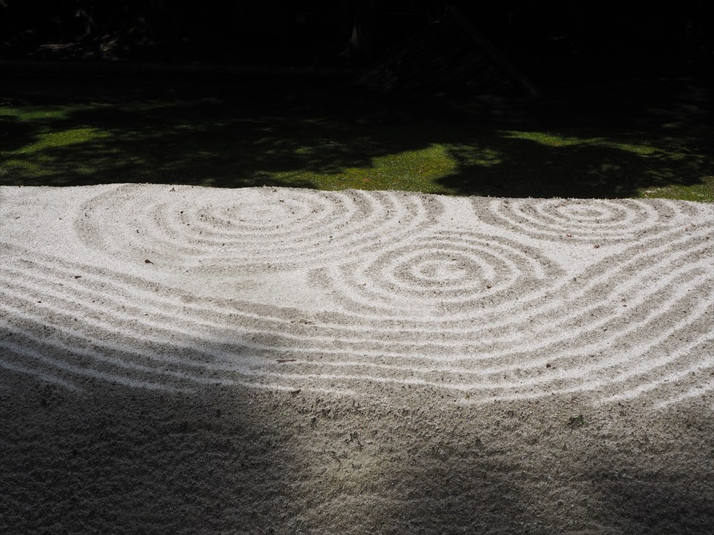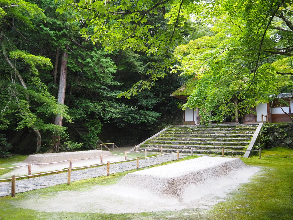 趣ある茅葺の山門をくぐると、左右に白砂壇(びゃくさだん)と呼ばれる長方形の白い砂盛が現れます。この白砂壇は水を表し、その間を通ることで心身を清めて浄域に入ることを意味しているのだそう。季節ごとに砂に描かれる模様が変わるため、近くまで行くと境内を覗いてみたくなります。