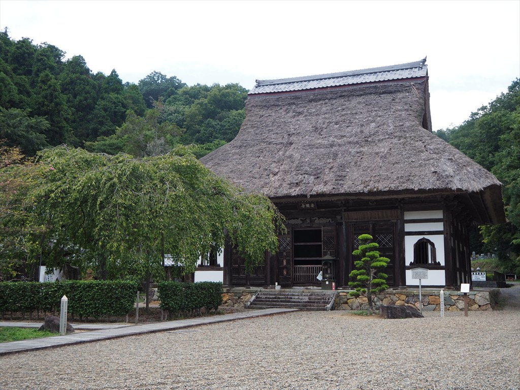境内は茅葺き屋根の本堂が印象的。堂内には安国寺になった当時の釈迦三尊像や、より古い平安時代の地蔵菩薩像も祀られています。本堂前は春にはしだれ桜が綺麗です。