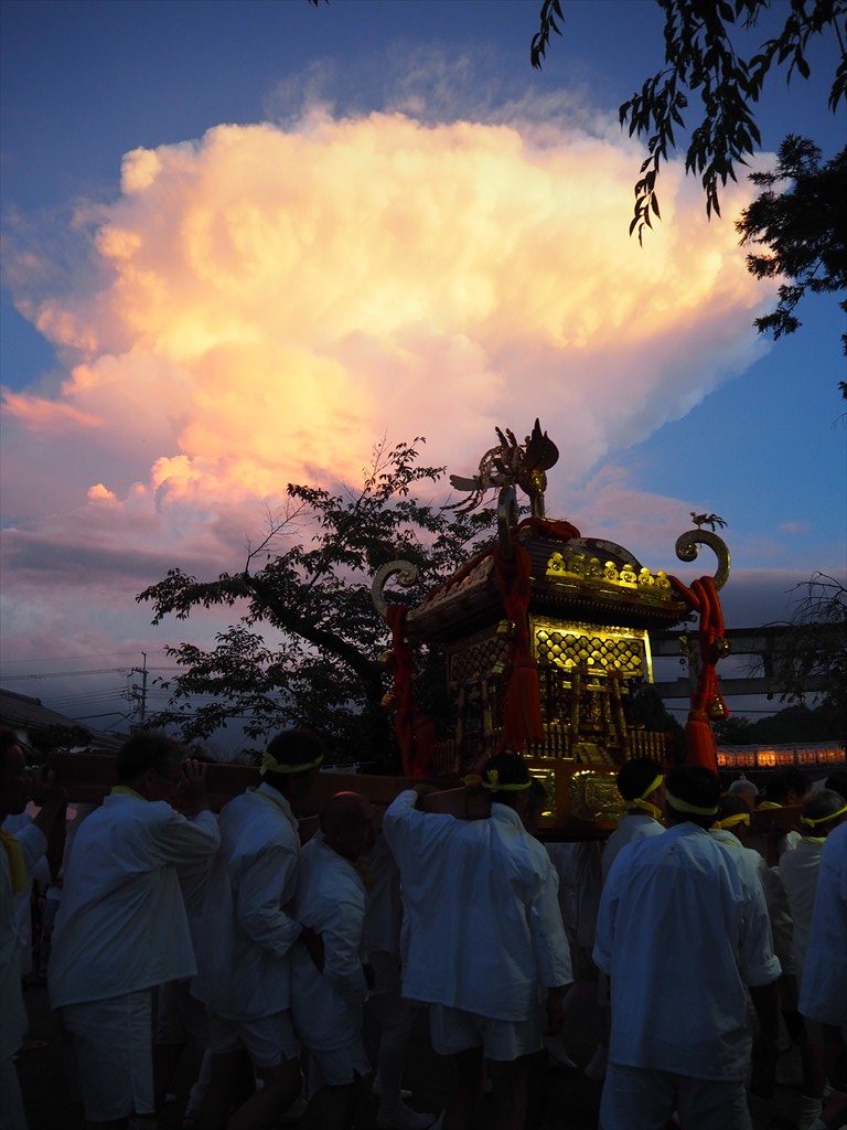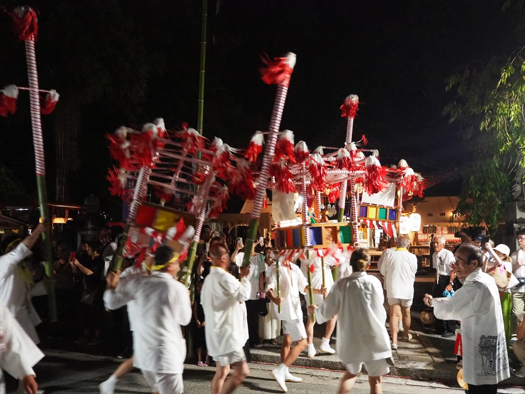 その後、「灯籠追い」が行われます。神輿が神社の前から南の鳥居方向へと進むと、風流灯籠5基を上下に振りながら後を追いかけます。露店が並んでいる辺りまで進むと、今度は逆向きに灯籠が前で神輿が後から追いかける形となって、灯籠5基が境内へと戻っていきました。これを2回繰り返します。