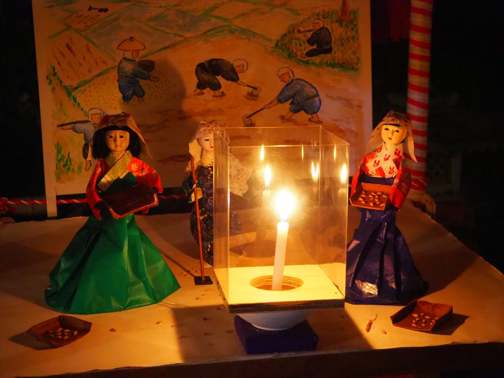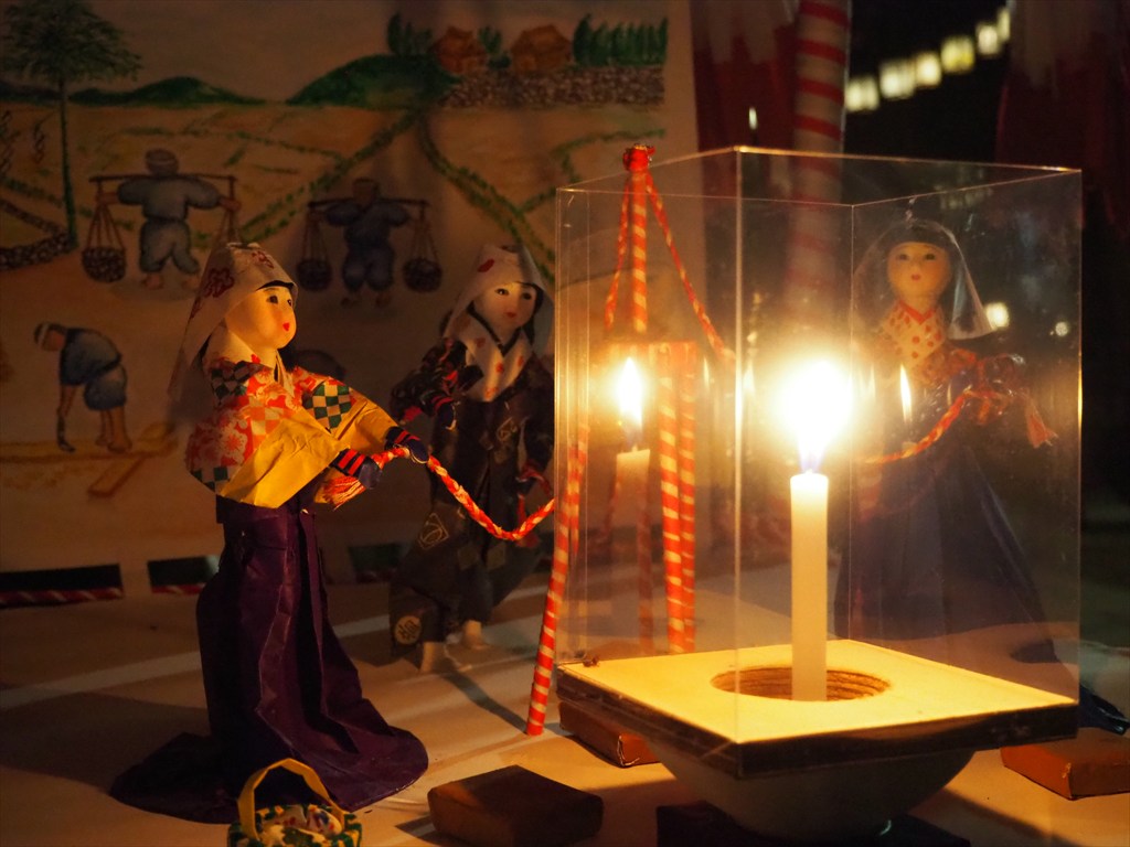 日中に氏子地域を巡っていた神輿や太鼓は18時45分頃に薭田野神社へと戻ってきました。その後、拝殿に神輿が安置されると神輿から本殿への御霊遷しが行われ、神事が続きます(浄瑠璃は鳥居前の佐伯灯籠保存会資料館で並行して奉納され続けています)。また、年間の農事を現した風流灯籠5基は神社内の北西側に置かれ、蝋燭の灯りがともされて幻想的でした。神事後は、境内で太鼓が打たれて音が響いていました。