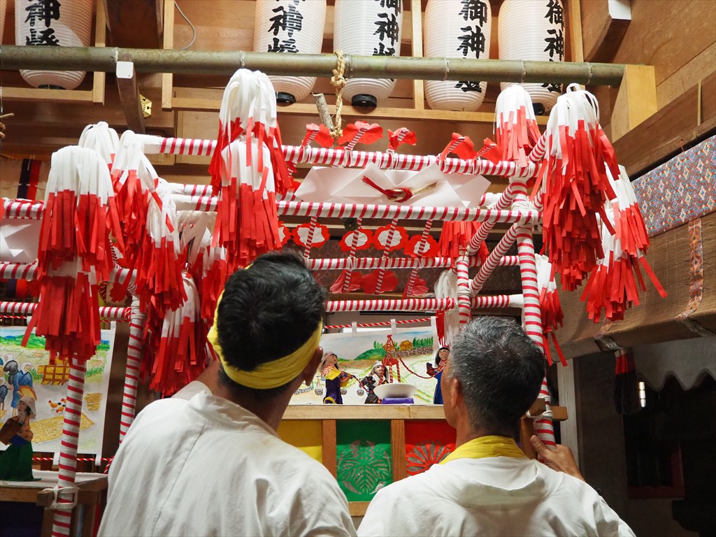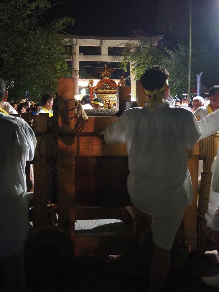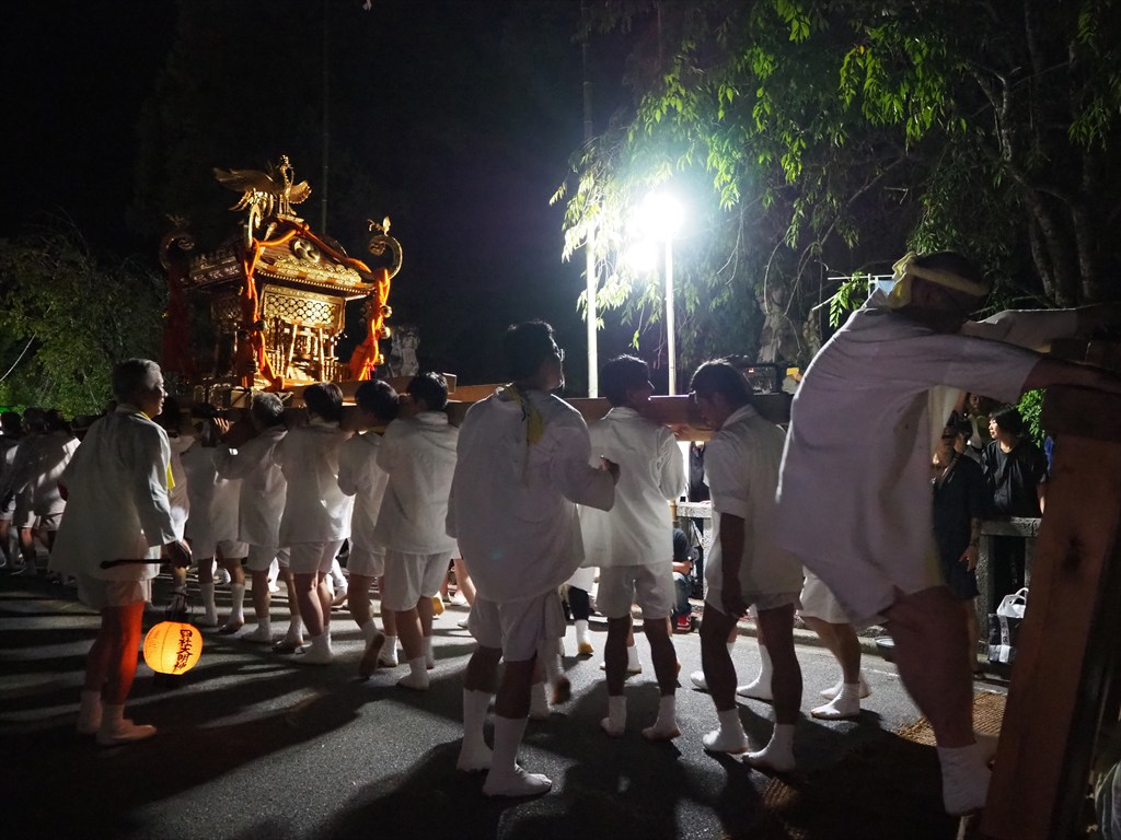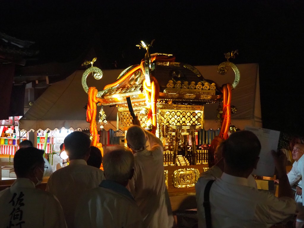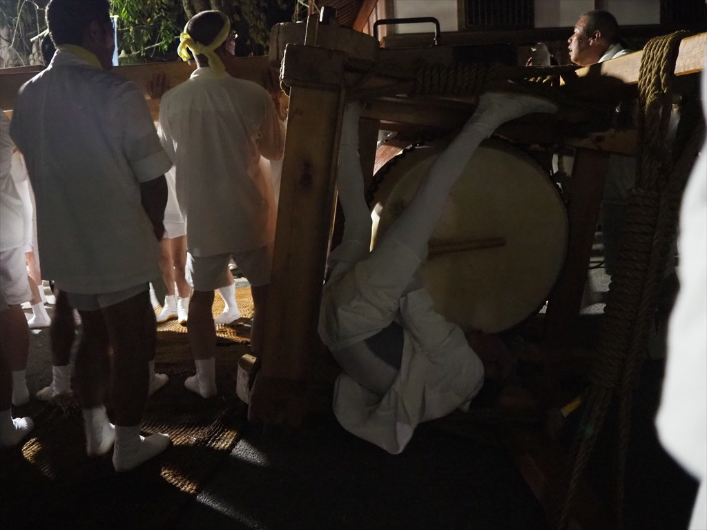 神輿と太鼓は境内へ戻り、続いて風流灯籠5基を本殿前に吊る「灯籠吊り」が最後に行われました。吊られた灯籠の前で石場搗き歌が歌われます。時刻は22時30分頃でしたが、かつては日付が変わるまで行われていたそうです。この後、神輿・太鼓を含めた祭り道具の次年度の輪番への引継ぎが行われ、ひとつひとつ丁寧に傷が無いかの確認をしながら引き継がれていきました。「明年度」が終わった段階で観客はほとんどいなくなり、私もこの引継ぎの場面まで目にして、神社を後にしました。