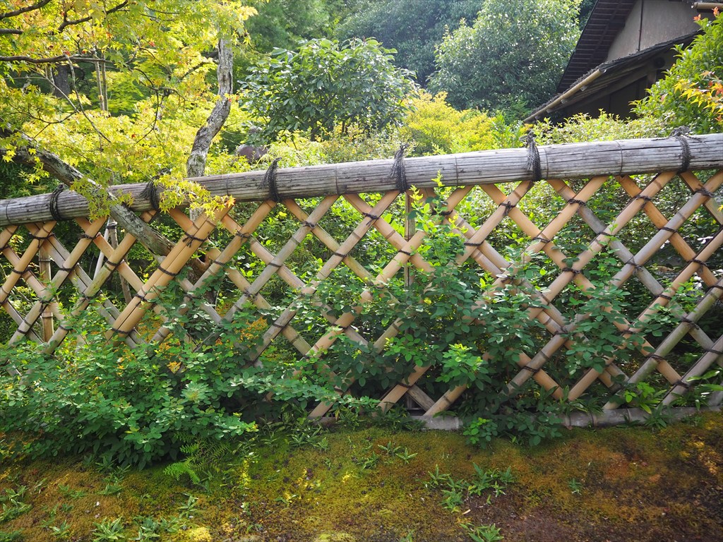 境内で目を引くのは「光悦垣」と呼ばれる独特の垣根。茶室・大虚庵前にあり、割り竹を菱形に組み、割り竹の束を乗せたもので、頭部がゆるやかな曲線をえがきます。本阿弥光悦が好んだ意匠とされるところから光悦垣と呼ばれ、だんだんと背が低くなる様子から臥牛垣とも呼ばれています。紅葉との取り合わせが特に美しく人気を集めますが、緑の時期ももちろん絵になります。紅葉シーズンは賑わう境内ですが、この時期の光悦寺は人も少なく、豊かな緑に囲まれたお庭をゆっくりと散策することができておすすめです。萩がほんの少しだけ花を咲かせていたり、ススキの穂が出始めているところもありました。
