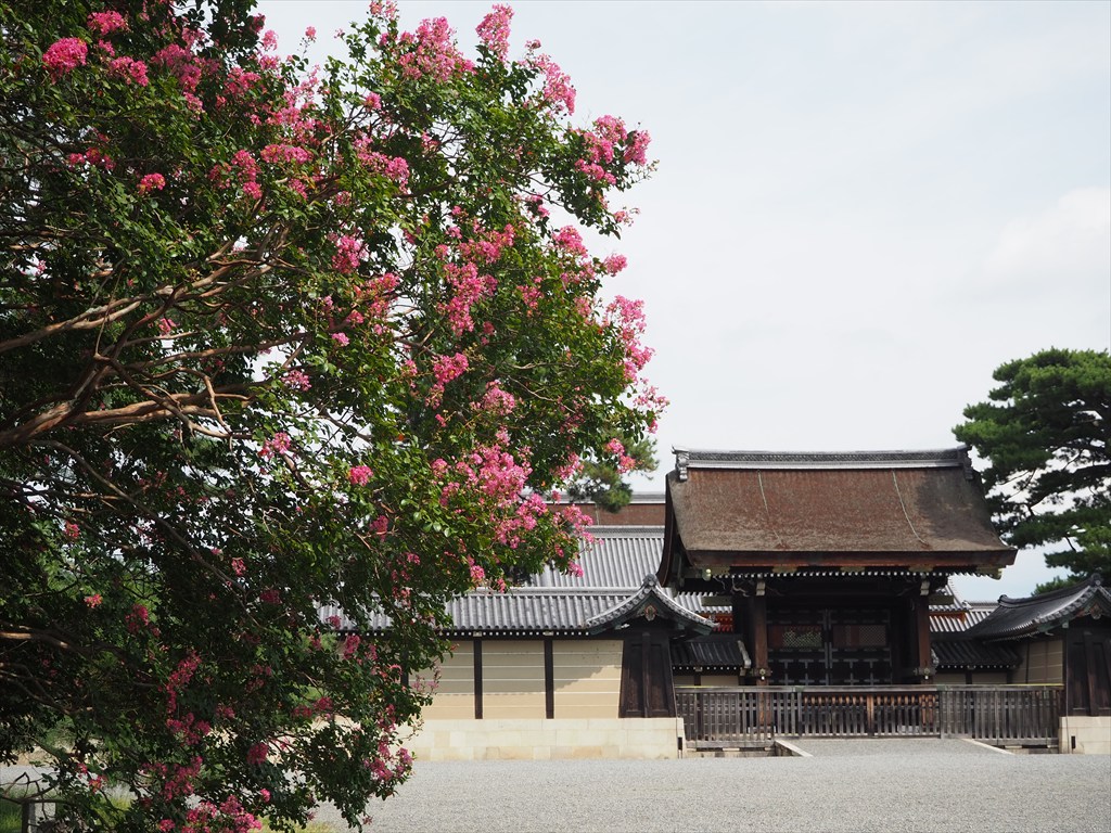 この時期は、御所を囲む御苑内の各地で美しいサルスベリが咲いていて目を引き、御所の南の正門である建礼門をバックに、京都らしい写真を撮ることもできました。寺町御門を出た場所にも咲いています。歴史的な建築にもよく似合う花だと思います。御苑内では拾翠亭からの眺めも見事。まだまだ暑い日が続きますが、一方で周囲では虫の音が心地よく響き渡っています。御苑の夏の彩りにも目を向けつつ、秋の気配も感じてみて下さい。