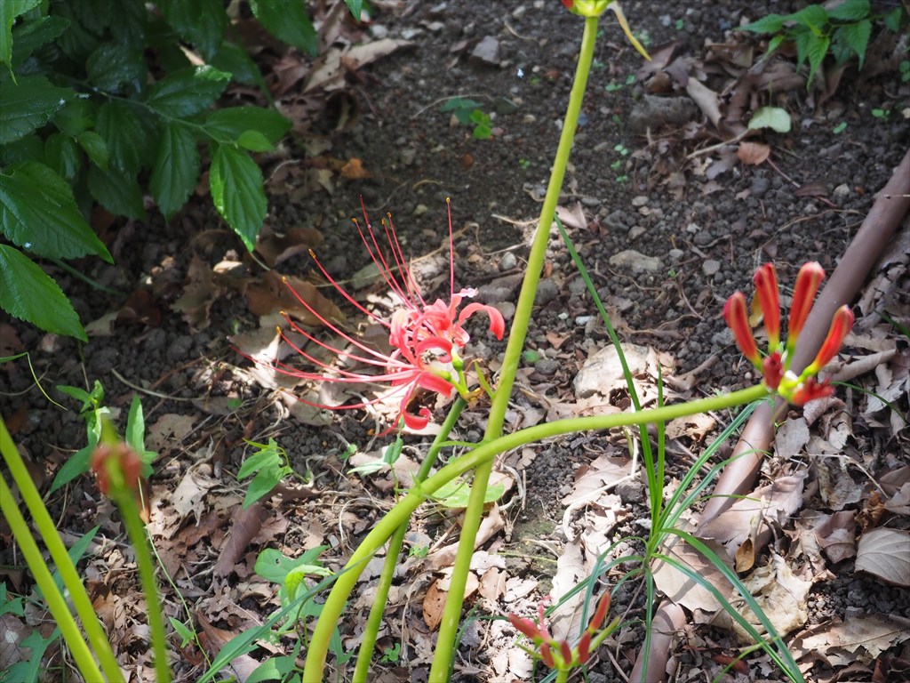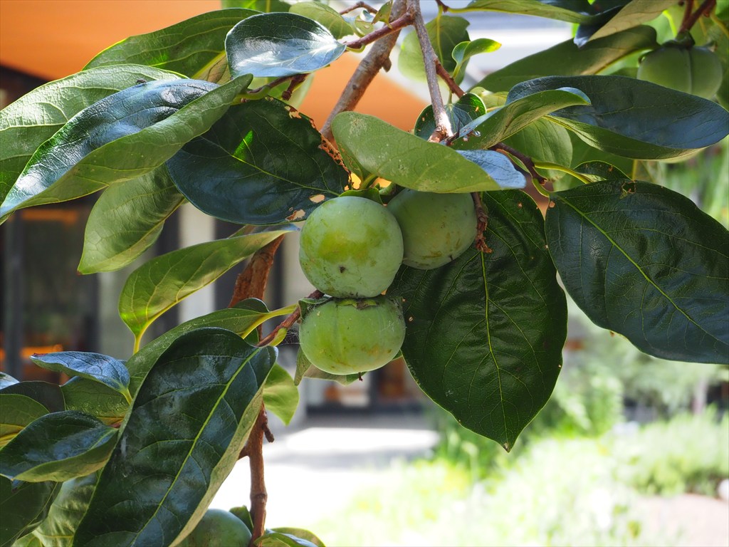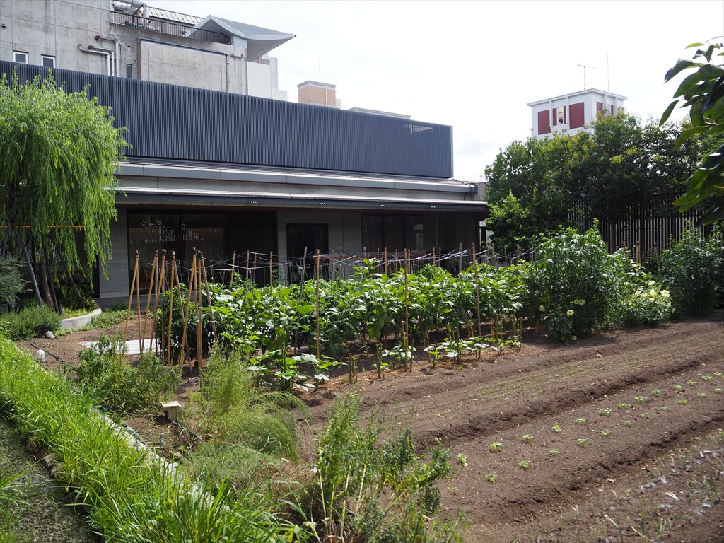 土は丹波から運んできたそうで、季節によっても植えられている作物が変わります。脇には彼岸花が咲き始めていました。柿の実もあって、少し季節の進みを感じました。