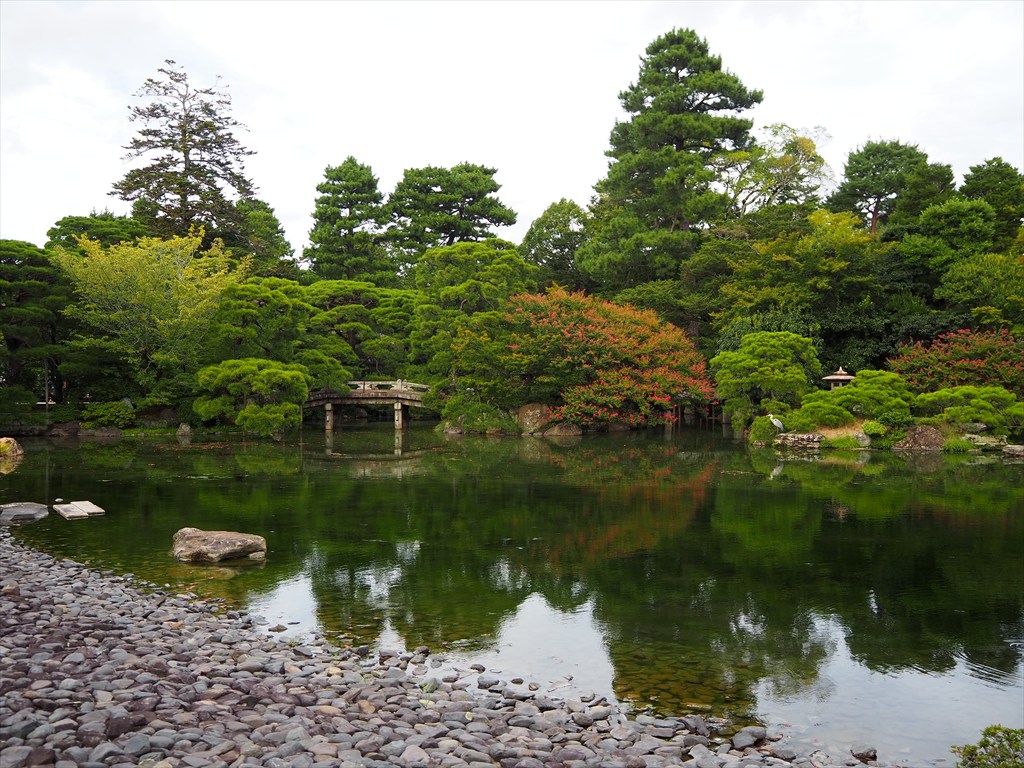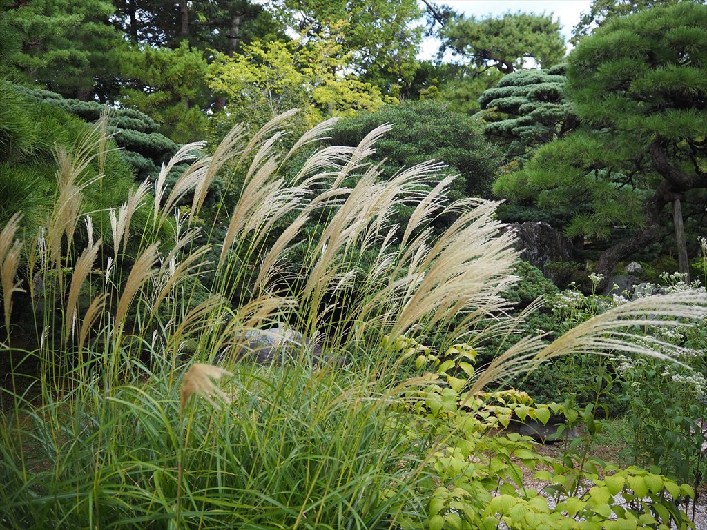 御池庭ではまだサルスベリの花が綺麗でした。基本は常緑の木々が目立ちますが、折々に少しずつ彩があるお庭です。一方の御内庭ではススキの穂が出て少しだけ季節の進みを感じました。