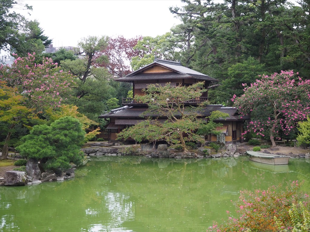 夏場はサルスベリの花が見事です。8月初めのブログでもご紹介しましたが、26日に訪れると、拾翠亭の東側のサルスベリの花は終わっていましたが、まだ北側の木は綺麗でした。今年は猛暑の影響で9月の末までサルスベリの花が見られます。訪れる人は多くはなく、運が良ければこの風景を貸し切りで楽しむことができるでしょう。サルスベリは今週末が見納めになるかもしれません。土曜日も公開されていますので、よければ訪れてみてください。