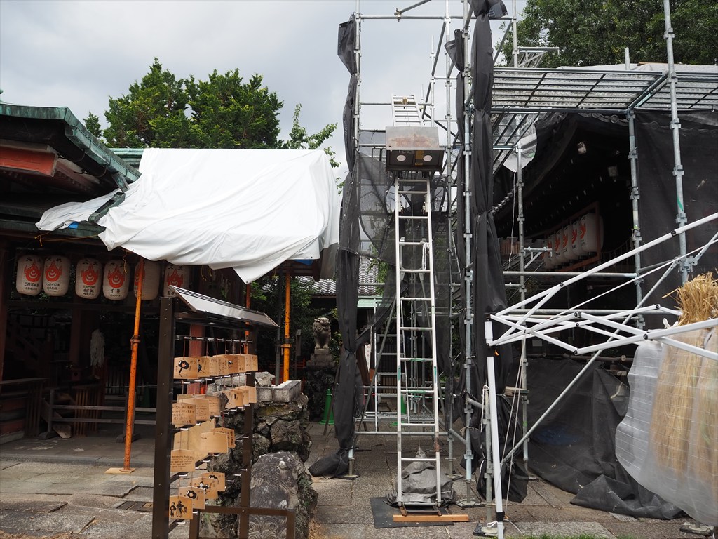今年の5月にご神木のエノキの大木が折れてしまい、社殿に大きな被害が発生しました。人的被害がなかったのがせめてもの幸いです。倒れた幹の片づけもおおむね終わっていますが、本殿前での参拝はできませんが、拝殿から参拝することができます。拝殿にも足場が設置されていました。