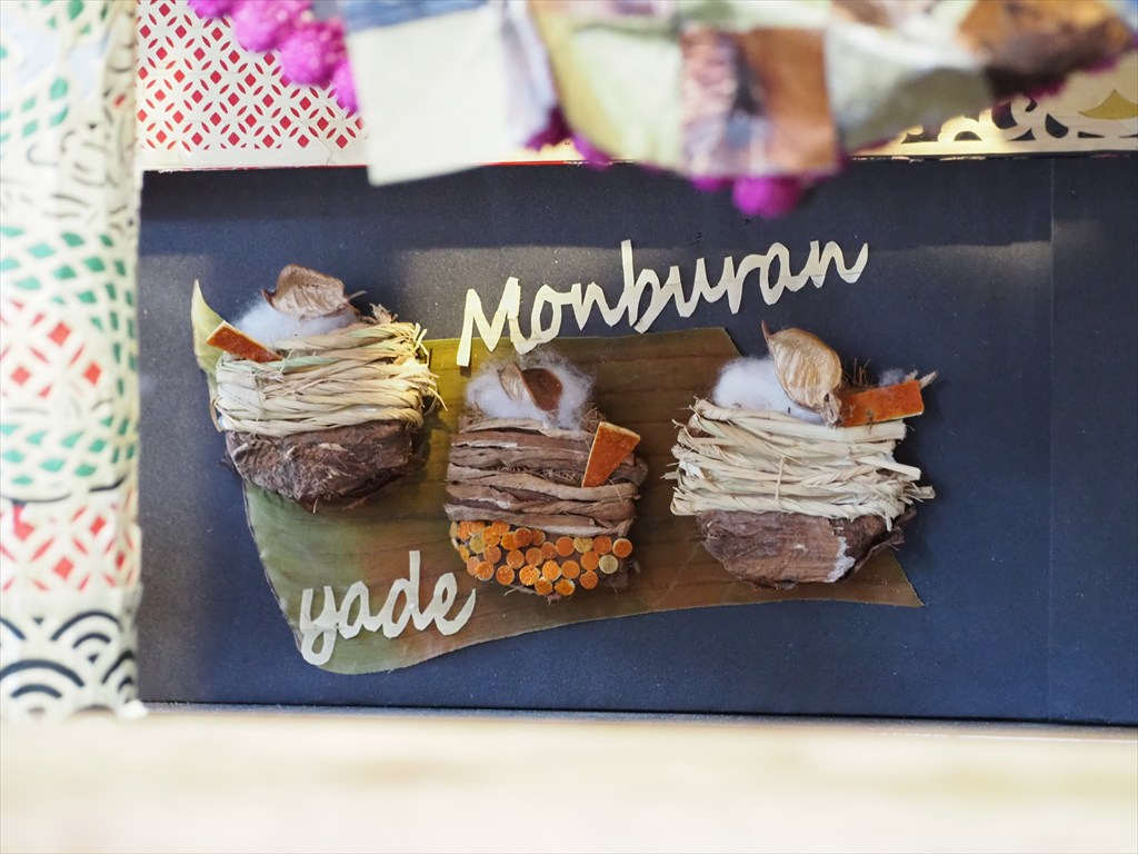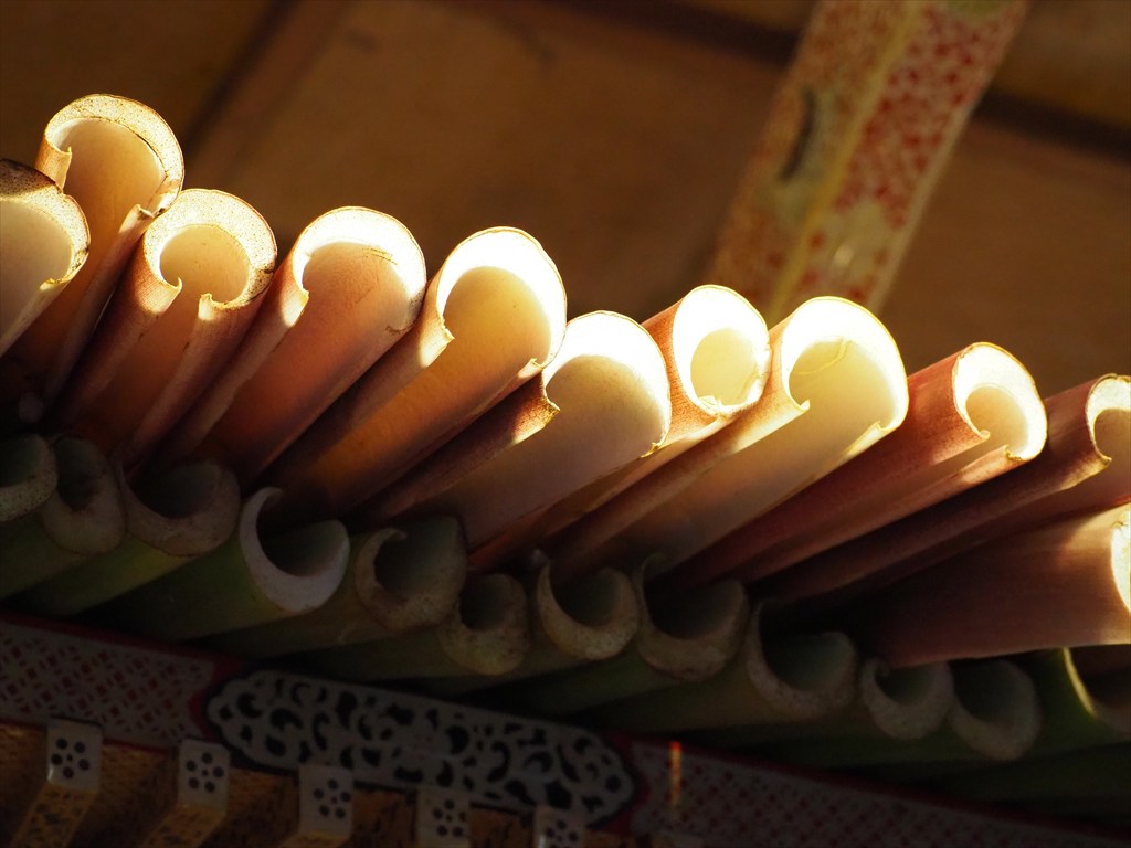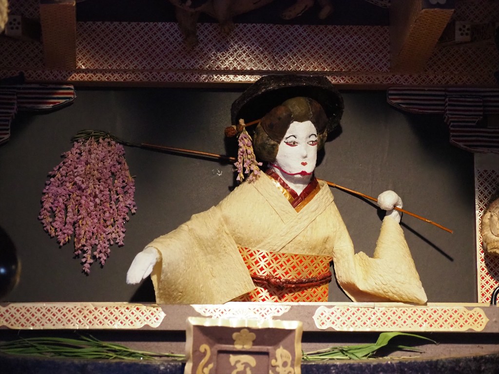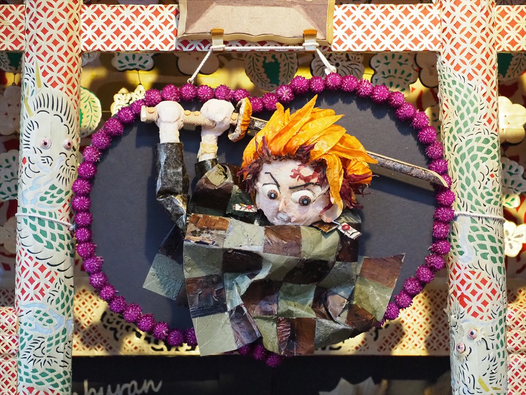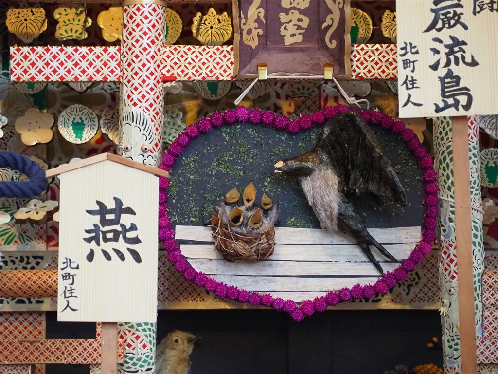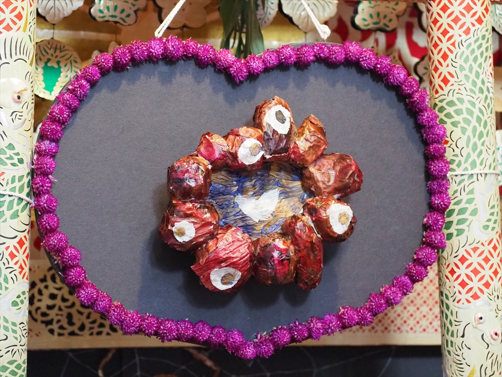 神輿の四方の飾り付けは毎年異なった物語が描かれており、楽しみにされている方も多いです。材料は「土に還るもの」で行われるため毎年作り直す必要があります。千日紅は9月1日に収穫をして乾燥させたのちに、糸を通す作業を行うとのこと。花の総数は1万にも及ぶそう。また数日間持たせるため、ずいきは前日に収穫をして屋根に飾り付けます。数日経つと乾燥して縮み、屋根に隙間ができてくるため、例年4日の還幸祭の前には隙間に補充をするそうです。