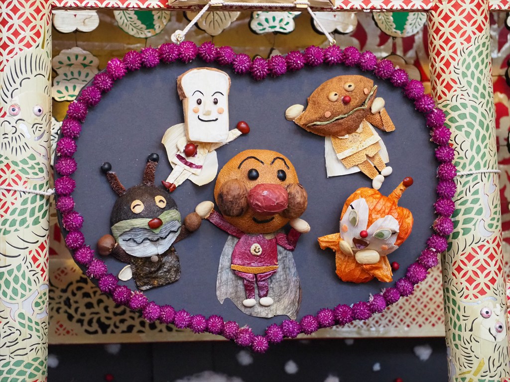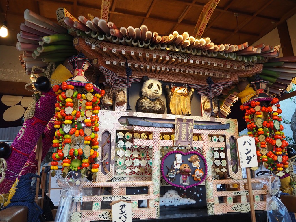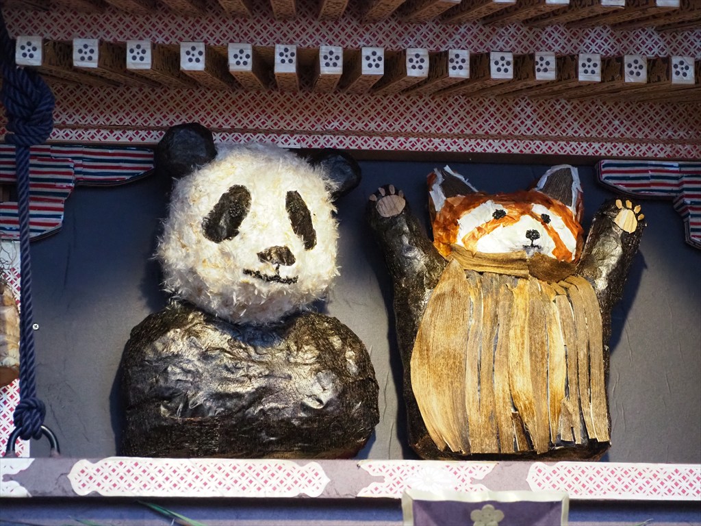 ずいき神輿は、それぞれ多彩な材料を見事なアイデアで使用して形作られていて、感嘆するばかり。毎年変わる四面では、今年はミャクミャク、大河ドラマ「べらぼう」にちなんだ善玉悪玉図(山東京伝「心学早染草」)、藤娘は映画の「国宝」にちなみ、パンダは和歌山のパンダが中国に帰った話題(レッサーパンダが替わって人気のようでその姿も)、アンパンマンは朝ドラにちなんでいるのでしょう。他にも鬼滅の刃や巌流島などがありました。その年の流行や話題を取り入れているため、何度でも見に行きたくなるお神輿です。そして子ども神輿では、ミッフィーちゃんや恐竜などがデザインされていました。