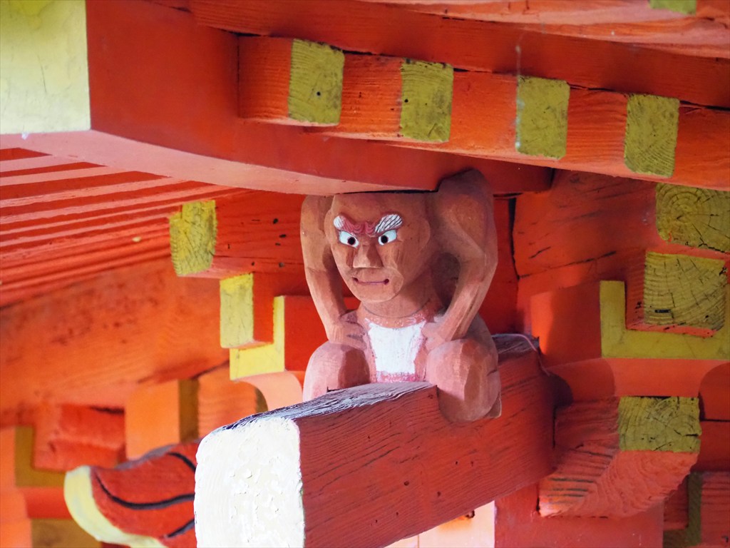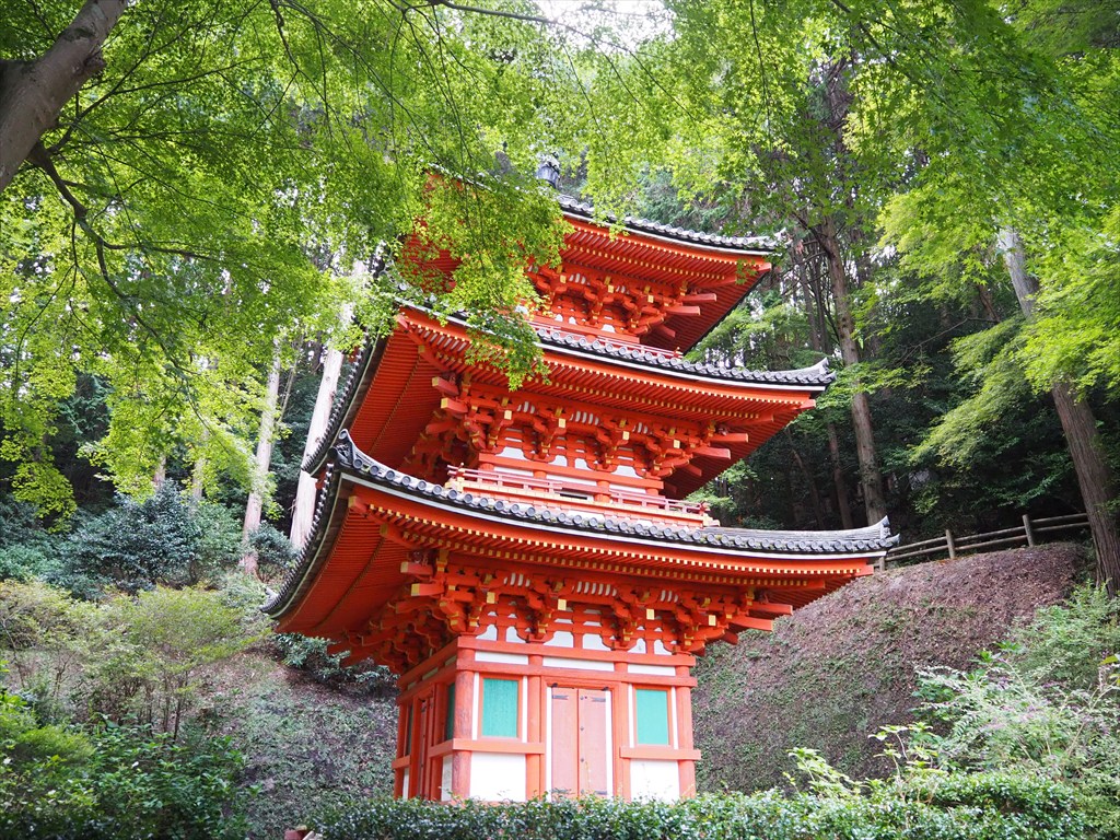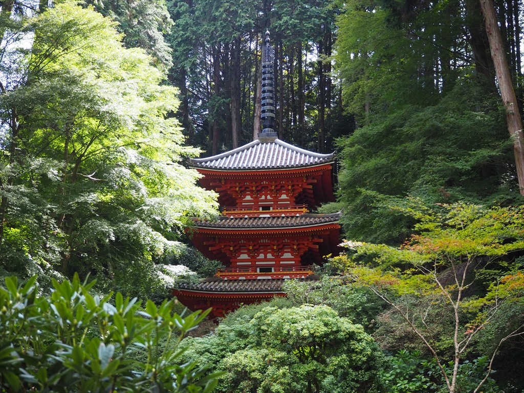 塔は山中に佇む姿が美しく、緑の時期も朱色が映えて美しいです。岩船寺の三重塔は、なんと周りの高い場所から、二層目・三層目と同じくらいの目線で見られてしまうという特徴もあります。こうして塔を少し高い場所から間近で見られる場所はなかなかありませんので、貴重なロケーション。塔の屋根を支えている天邪気(あまのじゃく)の頑張りも近くで見られます。