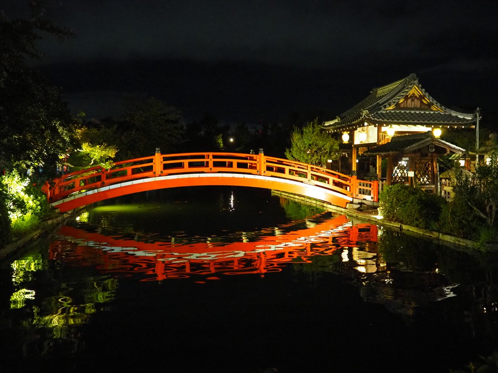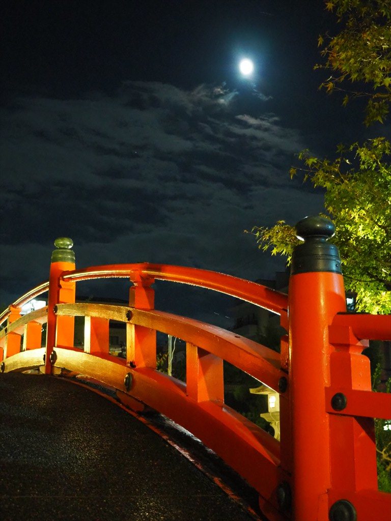 池に浮かぶ善女竜王社には真正面からも行けますが、朱色の法成橋に回り込み、願いを一つだけ思いながら渡って善女竜王社に参拝をすれば、願いがかなうとも言われています。神泉苑を象徴する美しい橋で、背景に月を望む光景も絵になります。観月会の日を外す方が、美しい月を静かに望むことができるでしょう。