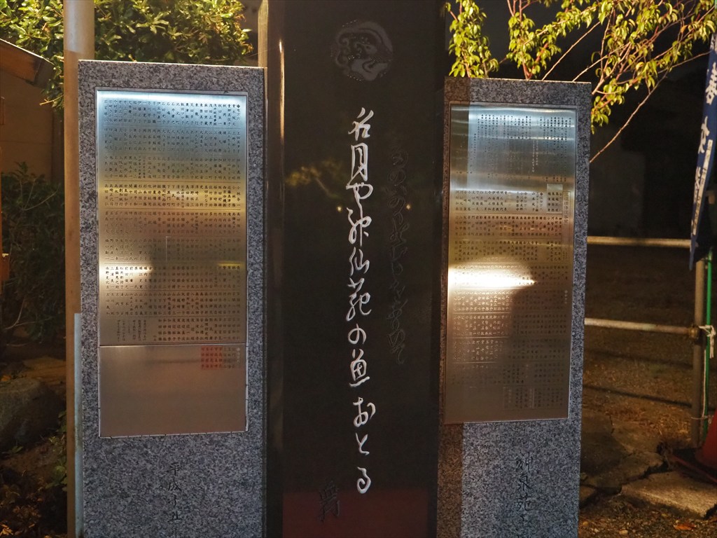 法成橋の西側、本堂の脇には、江戸時代の俳人で画家でもあった与謝蕪村の「名月や 神仙苑(神仙苑)の 魚(うお)おとる(躍る)」の句碑が建っています。句の脇には「雨のいのりのむかしをおもいて」と書かれており、蕪村は雨乞いの地としての神泉苑を思っていたことがわかります。