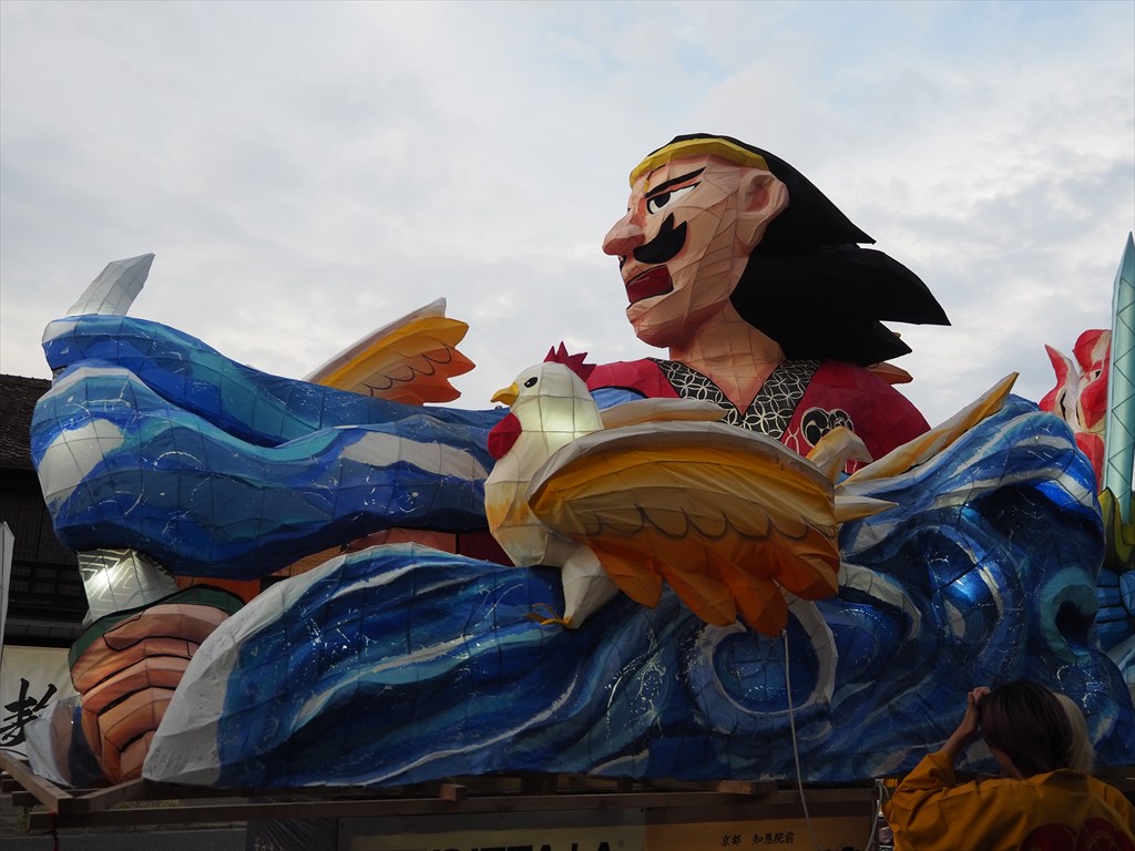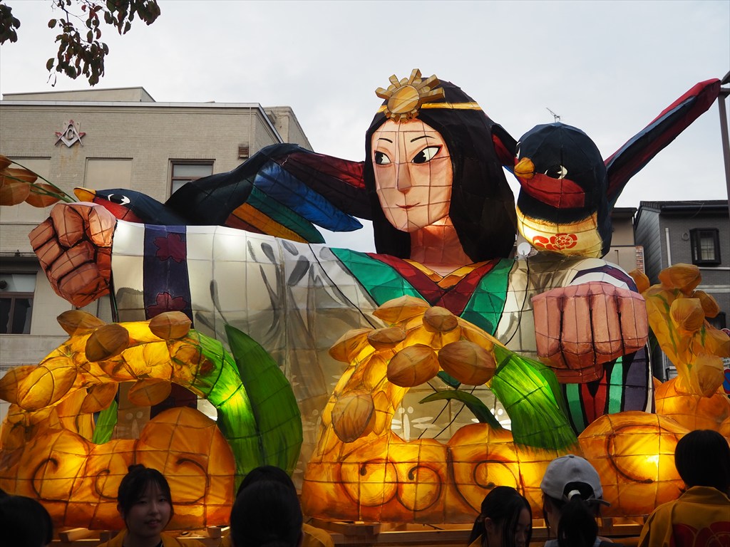 大燈呂は戦国時代の『言継卿記(ときつぐきょうき)』に載る風流(ふりゅう)燈籠がルーツとされ、江戸時代後期に途絶えましたが、2008年に京都造形芸術大学(現:京都芸術大学)の協力で復活しました。学生たちが青森のねぶたをイメージして作った灯籠があまりに見事であったため、神社が依頼をして作成したそう。毎年の作成に際しては毎年入れ替わる学生さんたちに社寺の歴史や信仰を理解する機会を設けて、燈籠のテーマを決めるなどされているそうです。