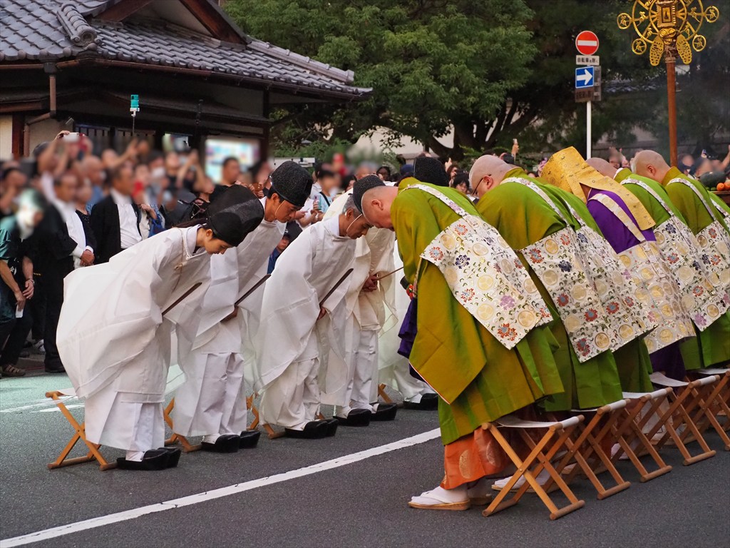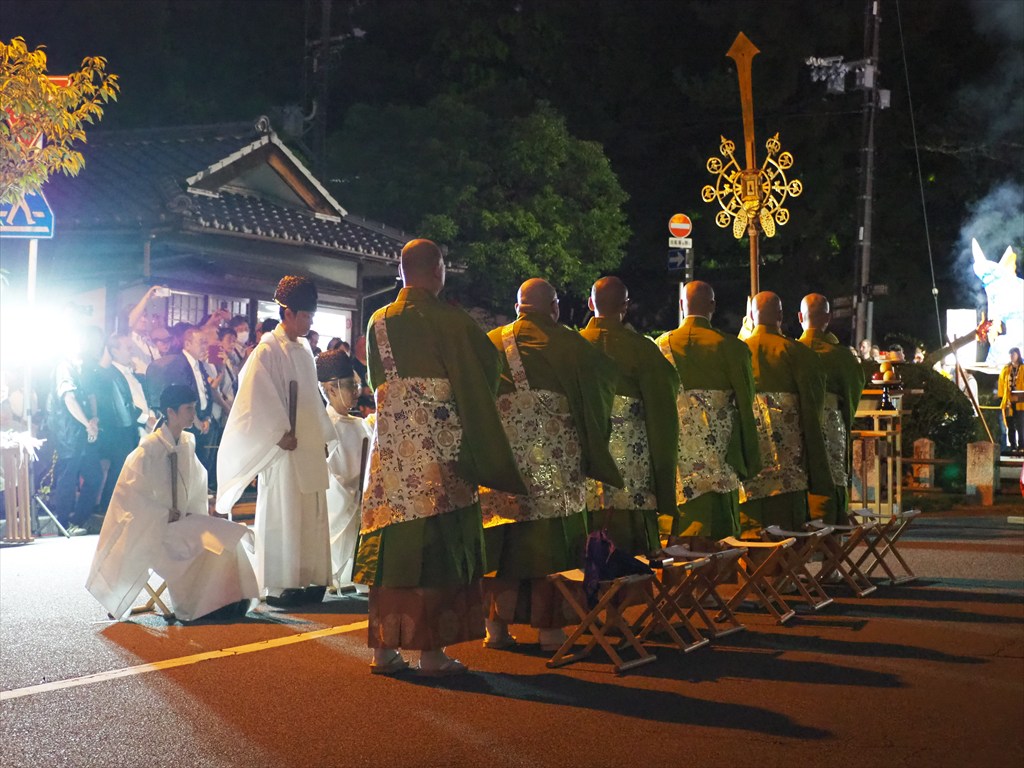 例年より早い開始でまだ明るいうちから始まりましたが、「れいけん祭」の最中にも日が暮れて、大燈呂も闇夜に浮かび上がってきて、明るいうちとは印象も変わっていきました。「れいけん祭」が終わるとお坊さんは知恩院へと帰っていき、粟田祭の一行は周辺を巡行して21時頃に神社へと戻っていきます。2年前に訪れた時には雨のため、神職のみでの神事でしたが、今年はお坊さんとの神仏習合の儀式を目にすることができました。