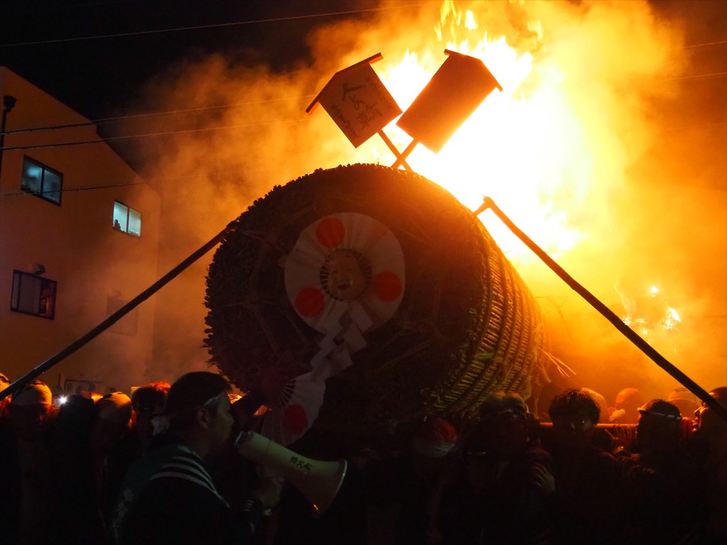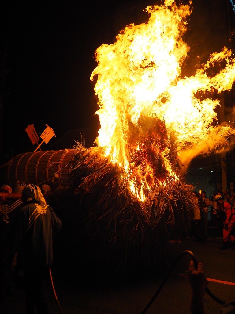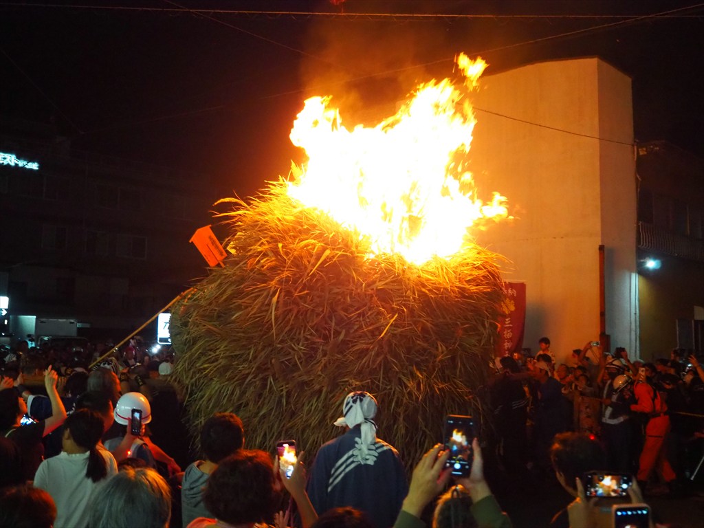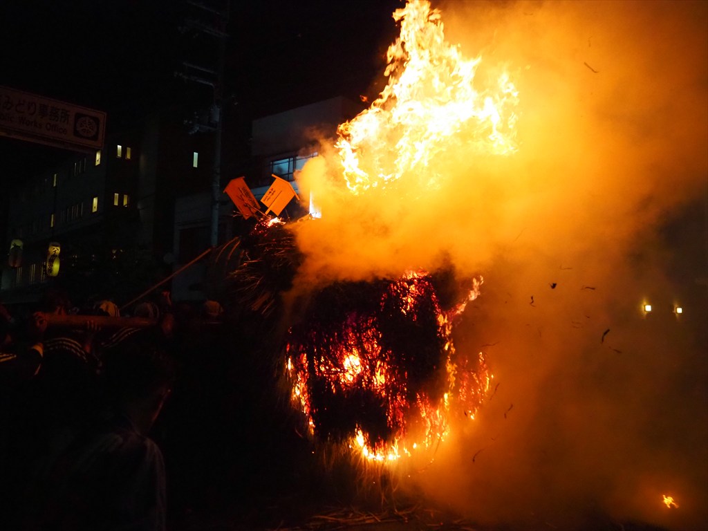 松明の後ろに火が灯されると、巨大な炎が一気に燃え上がって行きました。後ろからは同時に水をかけ、炎の勢いを押さえています。そして神輿を担ぐのと同じように、炎が点いた松明を竹田街道を北へ向かって担いでいきました。担ぎ手たちによる「あーよいよいよ!」の掛け声が響き、かなりの熱気を感じるなか、道の両側から地元の方が見守ります。大変迫力のあるお祭りです。燃えカスも勢いよく舞って、近くではかなりの量を浴びます。目に入った場合は目を擦らないようにご注意ください。