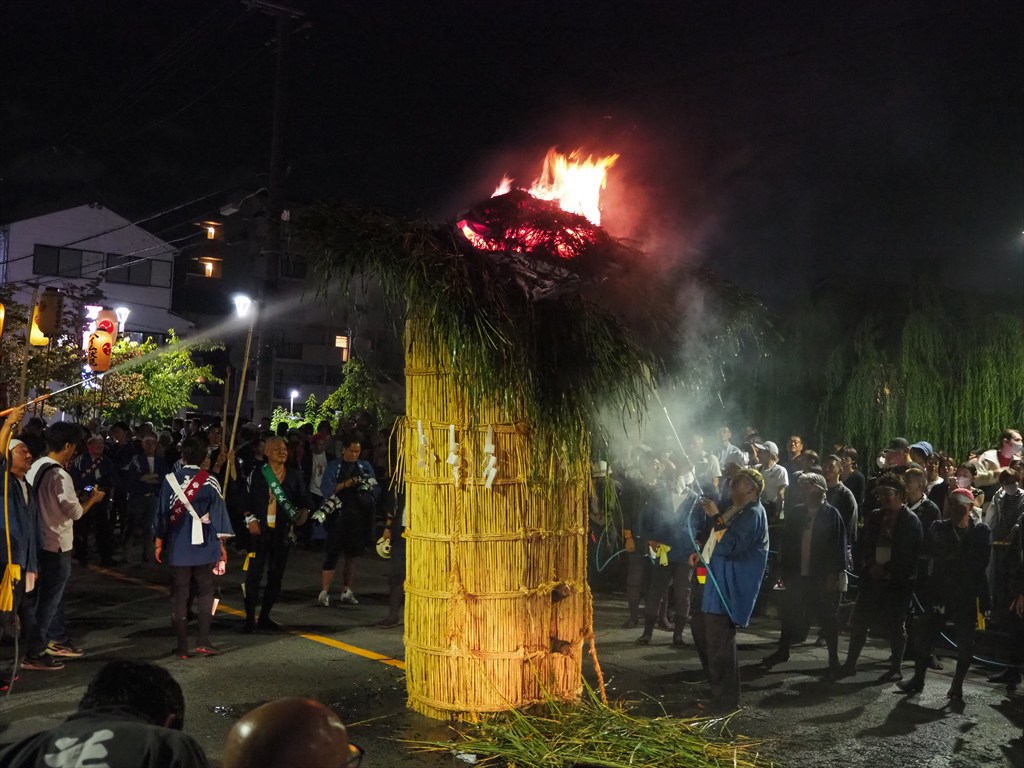 消火が終わると、人々は松明の葦の燃え残りを持ち帰って行かれます。火災除けのご利益があるのだとか。最後にやってくるのは清掃車。相当の燃えカスやススで道路が汚れますので、ちゃんと綺麗にしていくのです。こうした対応も興味深いお祭りです。そして神輿は御旅所へと引き返してきました。大松明が燃え上がる様子は動画もありますので、ぜひご覧になってみてください。