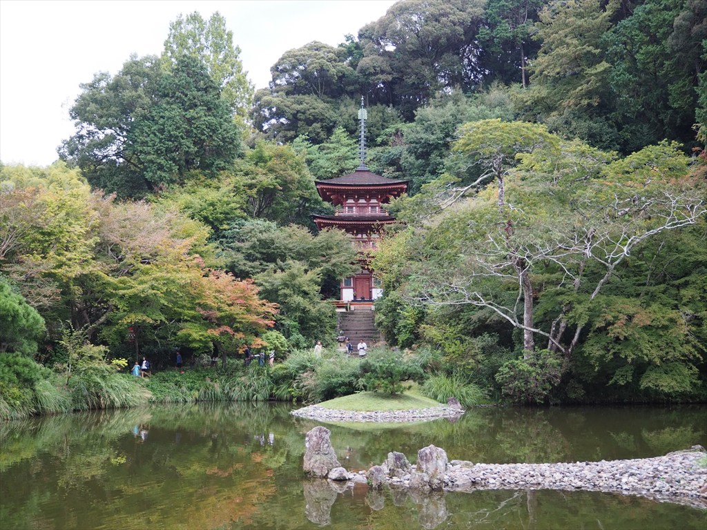 庭園は浄土思想を取り入れており、西に阿弥陀堂、東に薬師如来を祀る朱色の美しい三重塔があります。もともと寺の創建時の本尊は薬師如来と考えられており、薬師如来の浄土である薬師瑠璃光浄土から、寺は浄瑠璃寺と呼ばれました。薬師如来は、病といった現世の苦しみを除き、阿弥陀如来は来世で極楽浄土に導いて下さる仏様。ちなみに三重塔は平安時代の末期に一条大宮から移築された国宝の塔で、もし京都市街地にあればその後の戦乱や火災で焼失していたともいわれます。