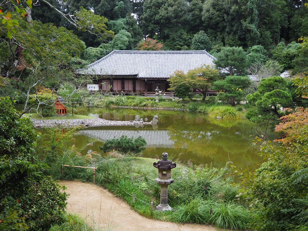 浄瑠璃寺の庭園は実は全国でもたった36カ所しかない「特別名勝」に指定されている貴重なお庭。境内で有料なのは阿弥陀堂の拝観のみで、お庭は自由に歩かせていただくことができます。風景が殊のほか美しいという特別名勝のお庭の眺め。往時は、阿弥陀堂の扉が開き、池に映る阿弥陀様のお姿に手を合わせていました。秋分の日には今でも扉が外されて、阿弥陀仏が池に映るそうですが、一般には非公開です。その素晴らしい光景が紹介されているNHKさんの動画がありました。ぜひご覧ください。