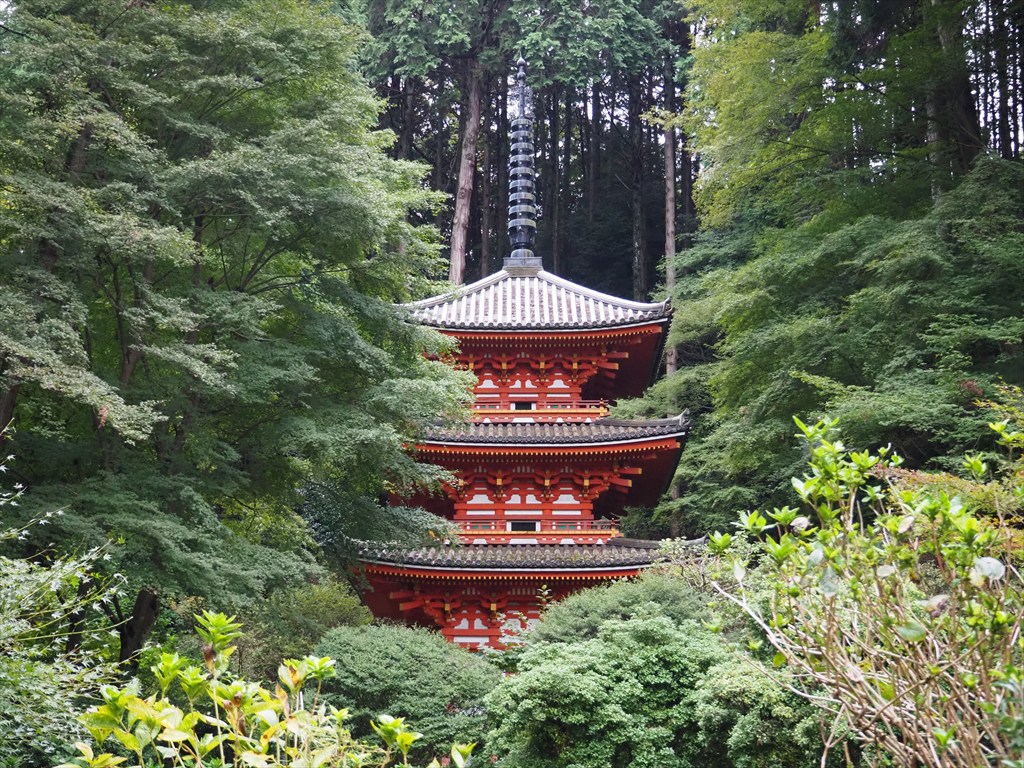 塔は山中に佇む姿が美しく、緑の時期も朱色が映えて美しいです。岩船寺の三重塔は、なんと周りの高い場所から、二層目・三層目と同じくらいの目線で見られてしまうという特徴もあります。こうして塔を少し高い場所から間近で見られる場所はなかなかありませんので、貴重なロケーション。塔の屋根を支えている天邪気(あまのじゃく)の頑張りも近くで見られます。
