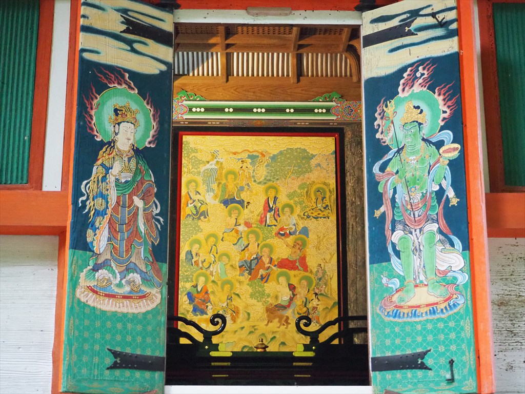 境内で目を引くのは、朱色が鮮やかな三重塔。室町時代に建てられたもので、東山の八坂の塔(1440年)とほぼ同時期の1442年の建立です。2003年に大修復が完了し、往時の色彩を取り戻しました。11月末までの土日祝日は初層扉の開扉が行われており、内部の壁画を目にすることができます(雨天・荒天時は中止の場合あり)。
