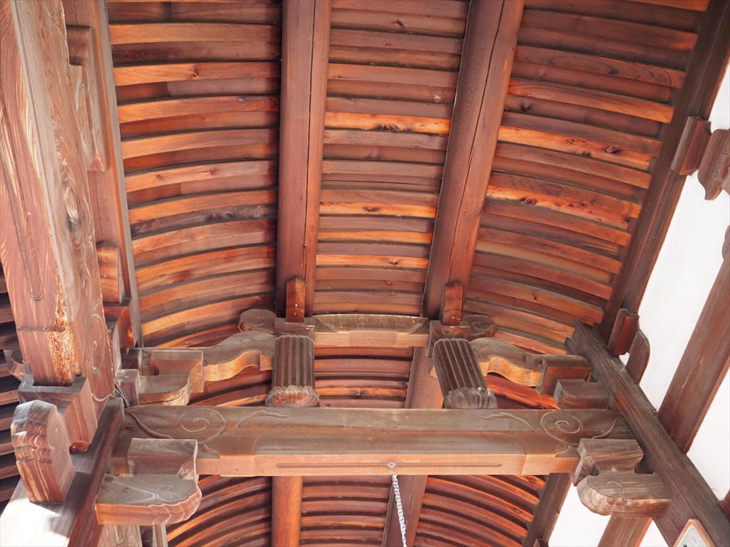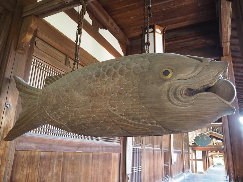 萬福寺の象徴が開梆(かいぱん、魚梆)と呼ばれる魚の形をした道具で、木製の魚が玉をくわえた姿。通常は横に掛けられたバットのような棒(今はかかっていない)で叩いて音を出し、行事や儀式の時刻を知らせます。玉は煩悩玉とも呼ばれてあぶくに例えられ、口からあぶくを吐くことで煩悩から解放されるというもの。また、魚は常に目を開けて眠らないように見えるため、眠気を覚まし怠惰を戒めるという意味もあります。