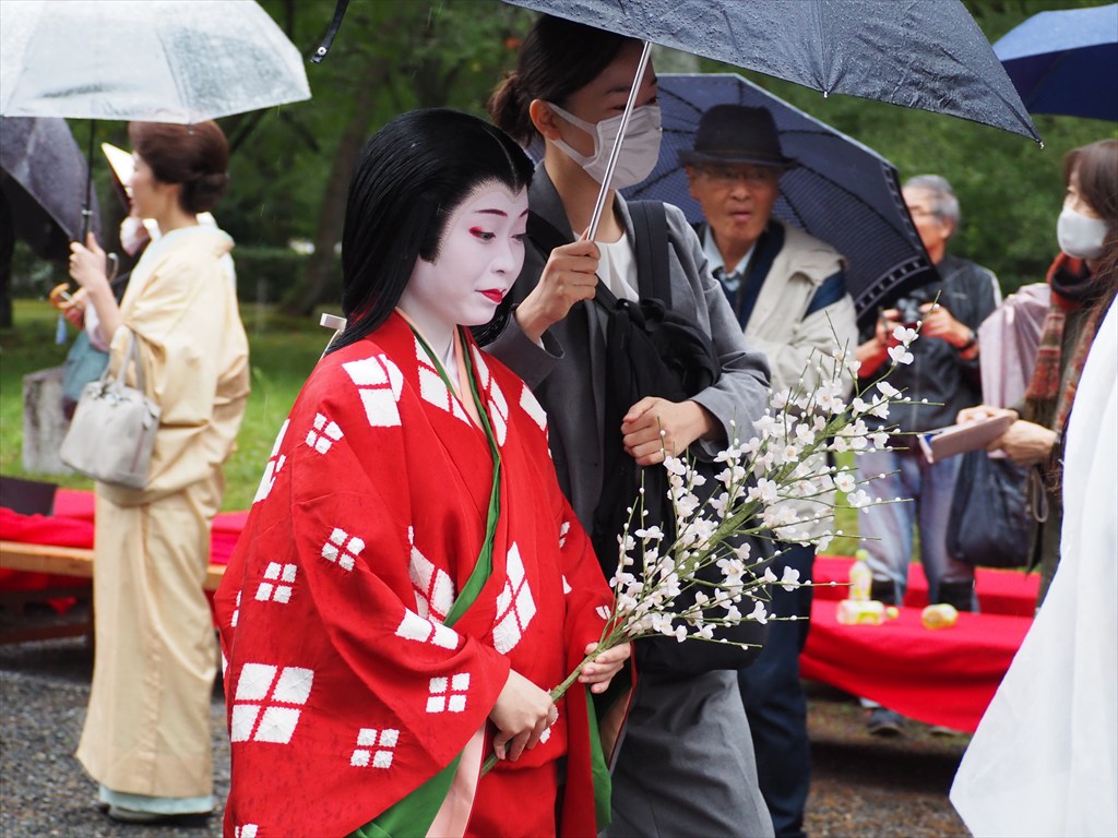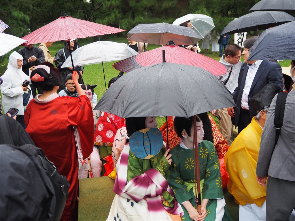 御苑での人気はやはり綺麗どころ。出発直前にやって来る芸舞妓さんが扮する役柄は大人気です。中世婦人列と平安時代婦人列に登場しますが到着後はあっという間にカメラマンに囲まれます。一番の花形の巴御前は凛々しい表情を見せてくださいました。御苑での様子は写真でご覧ください。