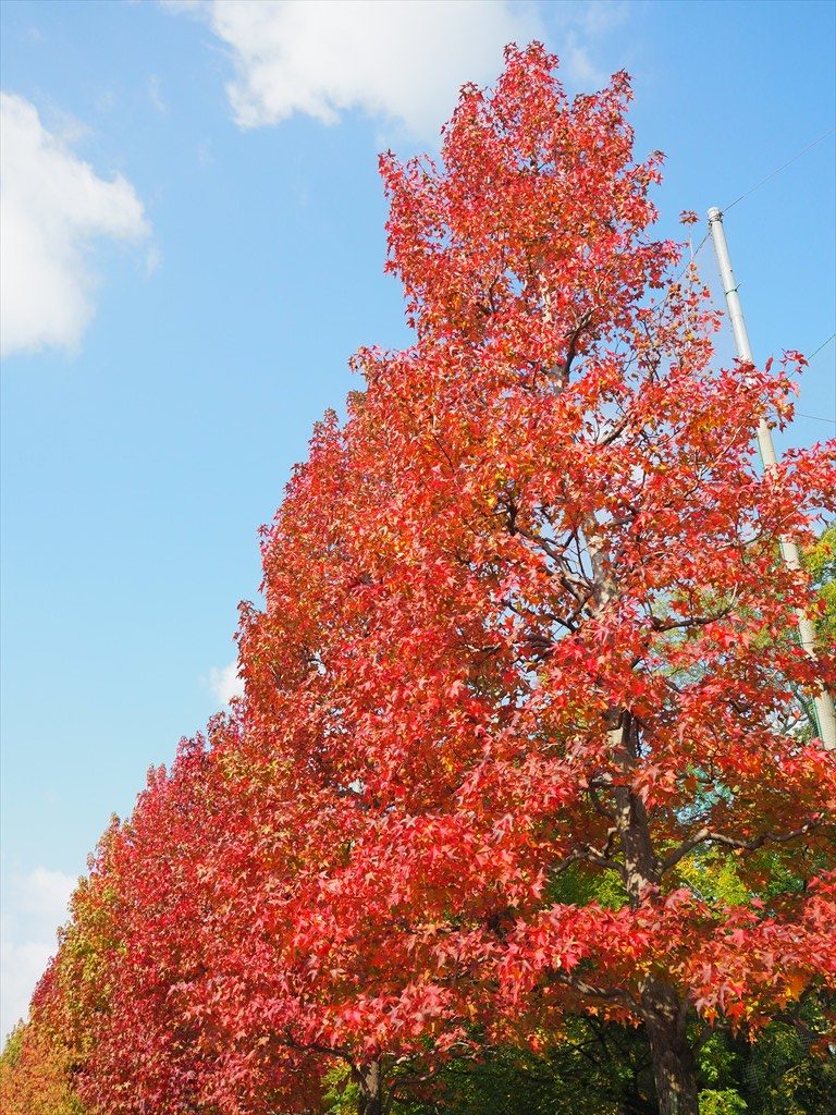 モミジバフウの植栽は西京区の桂坂が有名ですが、二条駅近くの中京中学校南側の木も綺麗に色づいています。京都縦貫道の南丹PAにも多く植わっています。グラデーションがモミジバフウの色づきの特徴で、木によっても色づき具合に差があるのが不思議です。