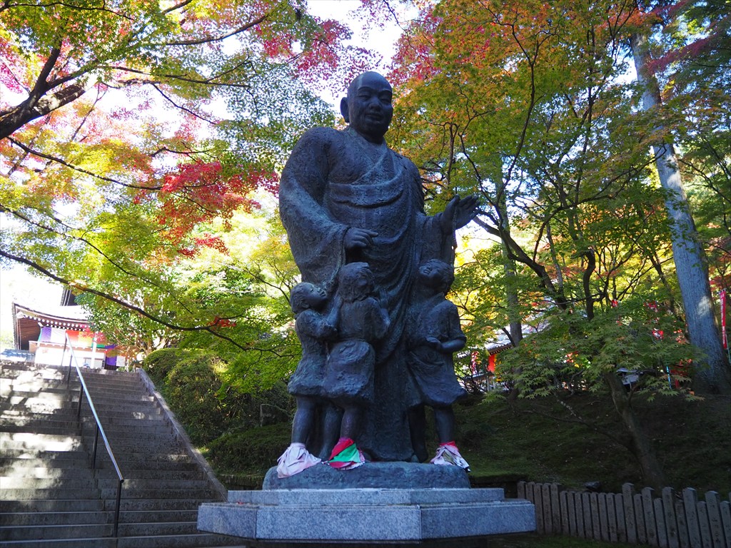 今熊野観音寺は、泉涌寺の山内にあるお寺で、本尊は十一面観音菩薩。西国三十三ヶ所観音霊場の15番札所、頭痛平癒のご利益でも知られるお寺です。その創建は、弘法大師・空海が自ら刻んだ観音像を安置したことに始まり、境内入り口でには「子護(こまもり)大師像」と呼ばれる、大きな弘法大師の像が迎えてくれます。