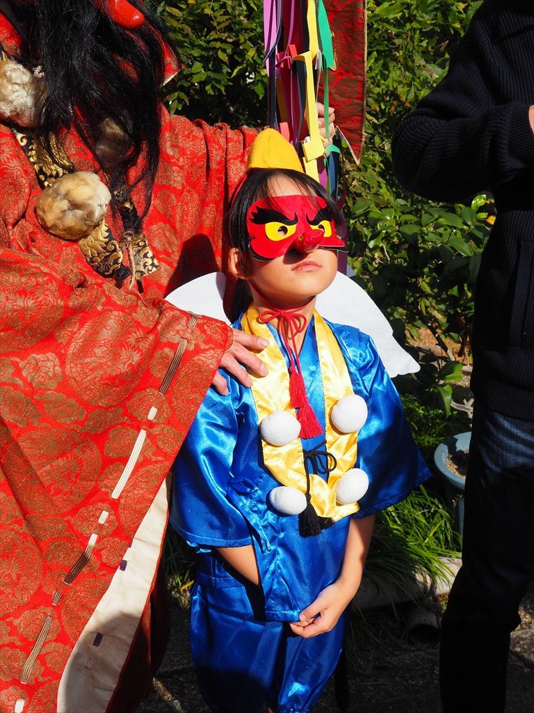 毎年11月15日には、法住寺合戦の折に後白河法皇の身代わりとなったという不動尊の祭礼、身代不動尊大祭があり、後白河天皇陵への参拝などの儀式が行われます。お稚児さんや赤、青、黒の鬼も登場して一緒に参列しているのが印象的で、今年はかわいい小天狗も参列していました。