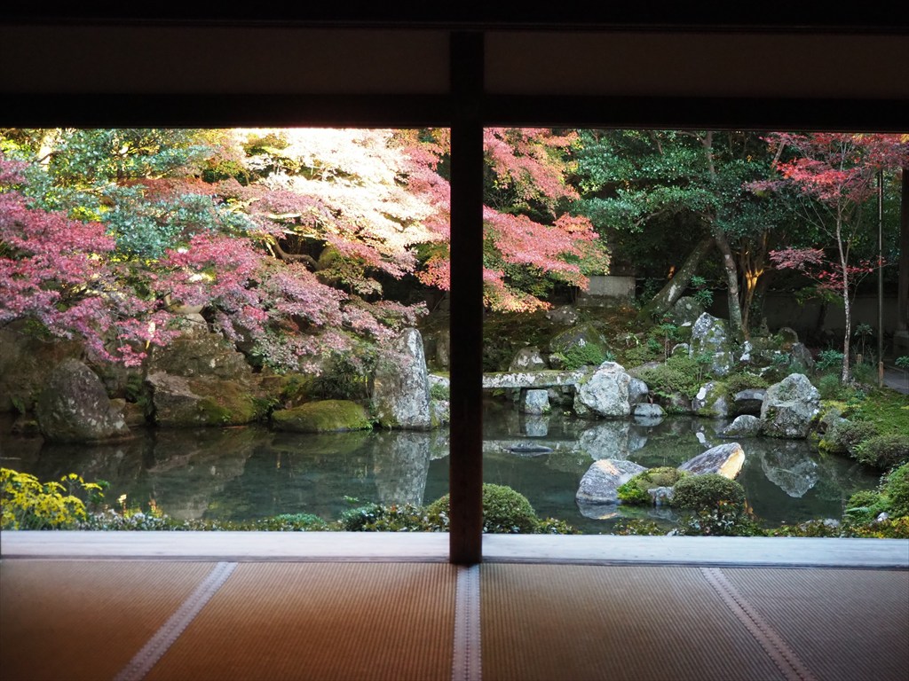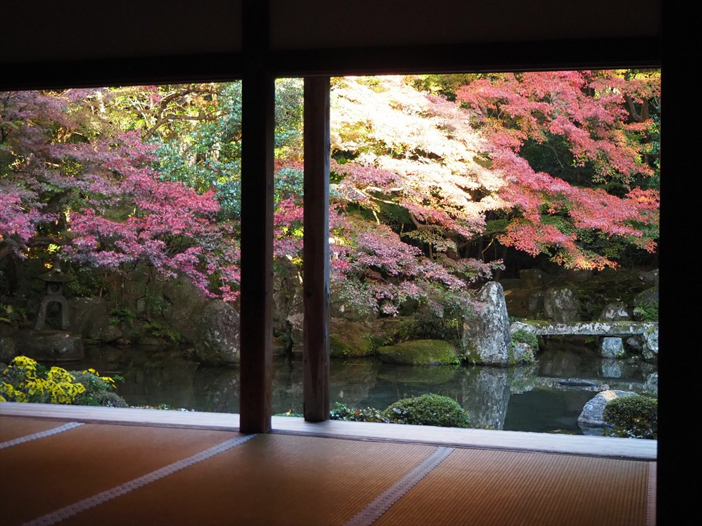 庭園は高野川の水を引いた池泉庭園で、庭園の造営者の名は不明ながら、江戸時代の名だたる文化人が携わっているお寺ですので、やはり心に訴えかけるお庭になっているのでしょう。室内の奥側に毛氈(もうせん)が敷かれ、縁側だけでなく室内から額縁のようにお庭を楽しめるようになっています。ただし、この時期は人がかなり多いです。