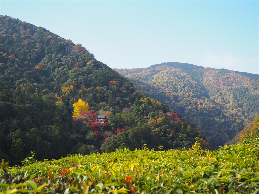 園内奥からは雄大な山並みも望めます。本当に変化に富んだ園内で、どの時期にもおすすめですが、現在は紅葉が最盛期を迎え、より一層魅力が増しています。