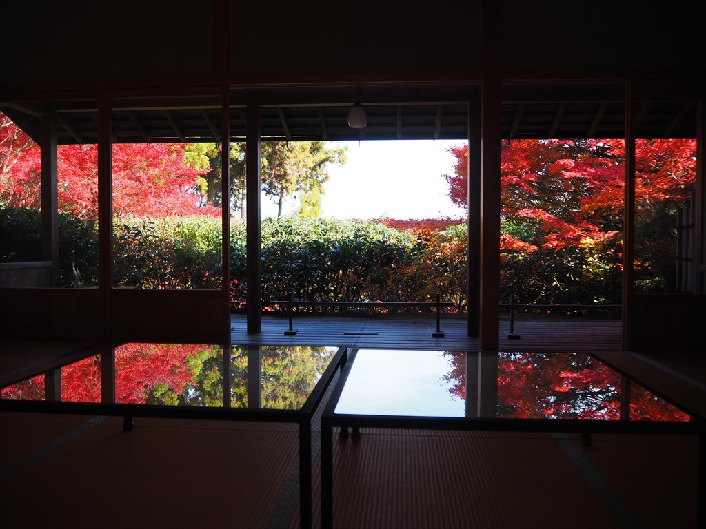 また、経路の終盤にある妙香庵では、静かに写経や座禅を組んだり、座して庭園を眺めることができます。こちらの写経の机がガラスでよく反射します。妙香庵は15時で閉まるのでご注意ください。見逃す方が多く、静かに過ごせる穴場といえるでしょう。