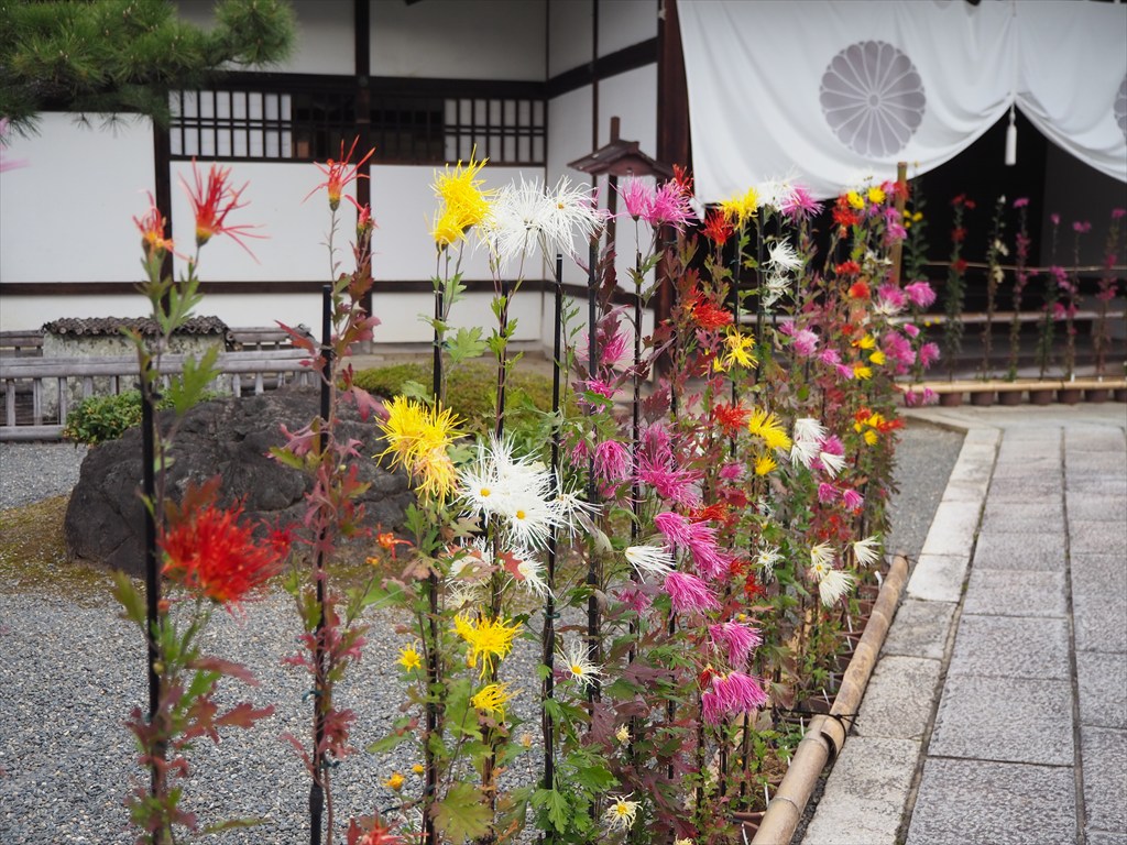 諸堂では嵯峨菊が多数並べられて、いけばな嵯峨御流の発祥のお寺としてこの時期は境内が華やかです。宸殿の前ではお庭にも出られ、嵯峨菊を鑑賞できるようになっています。
